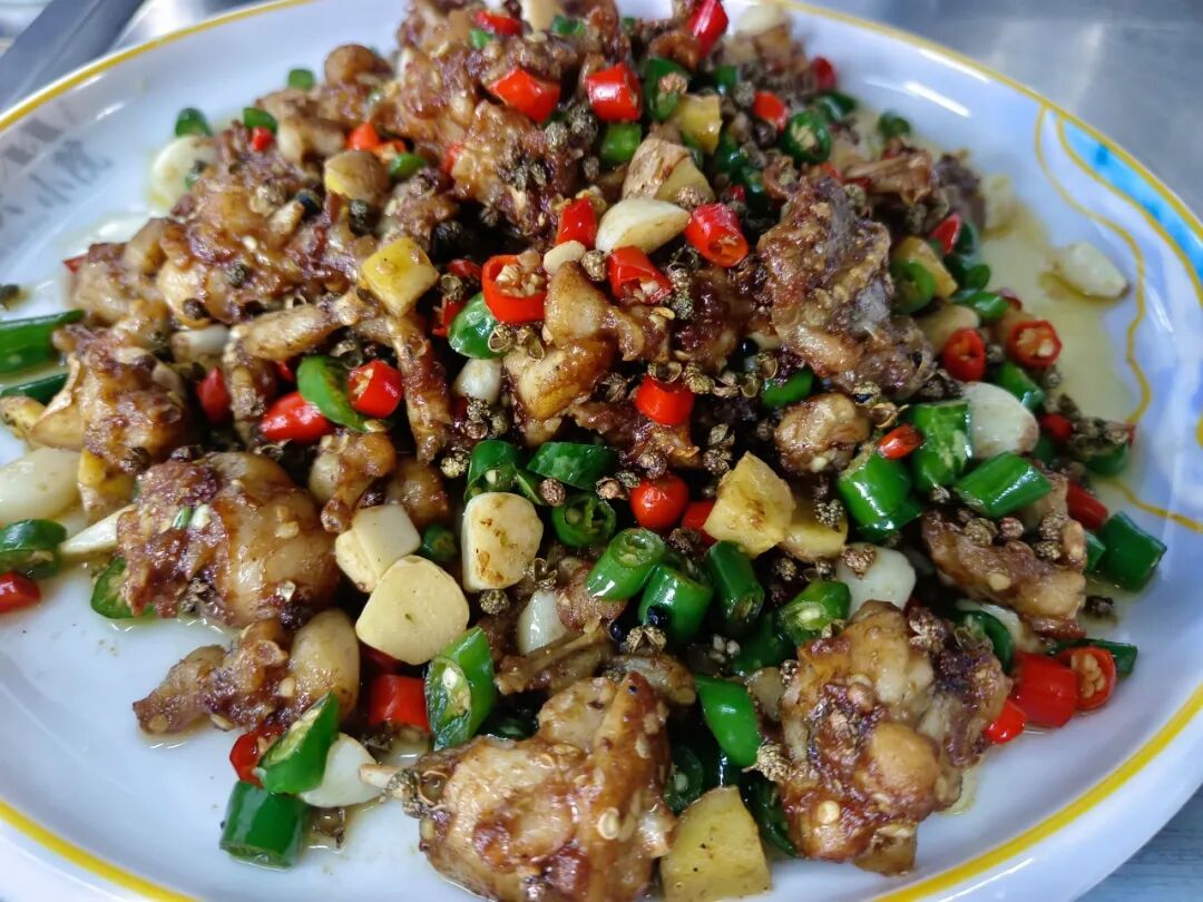 能让老客惦念、新客慕名的,正是这座小院里藏着的“舌尖功夫”。鱼与蛙是这里当之无愧的“当家花旦”。对于嗜辣者来说,心头好非椒麻美蛙莫属,从备料到出锅都有讲究。新鲜牛蛙切小块,加花椒面、酱油、蚝油抓匀腌制,七成热油中炸至金黄焦脆捞出备用。另起锅爆香花椒、红椒青椒、蒜瓣、姜片猛火炒出辛香,倒入牛蛙后淋酱油、蚝油提鲜,撒辣椒面、白胡椒面,浇上花椒油大火翻炒,让每块蛙肉裹满料汁。出锅时红亮蛙肉缀着翠绿辣椒圈,入口先麻后辣,再品蛙肉鲜脆,层次丰富,连骨缝里的香味都不愿浪费。