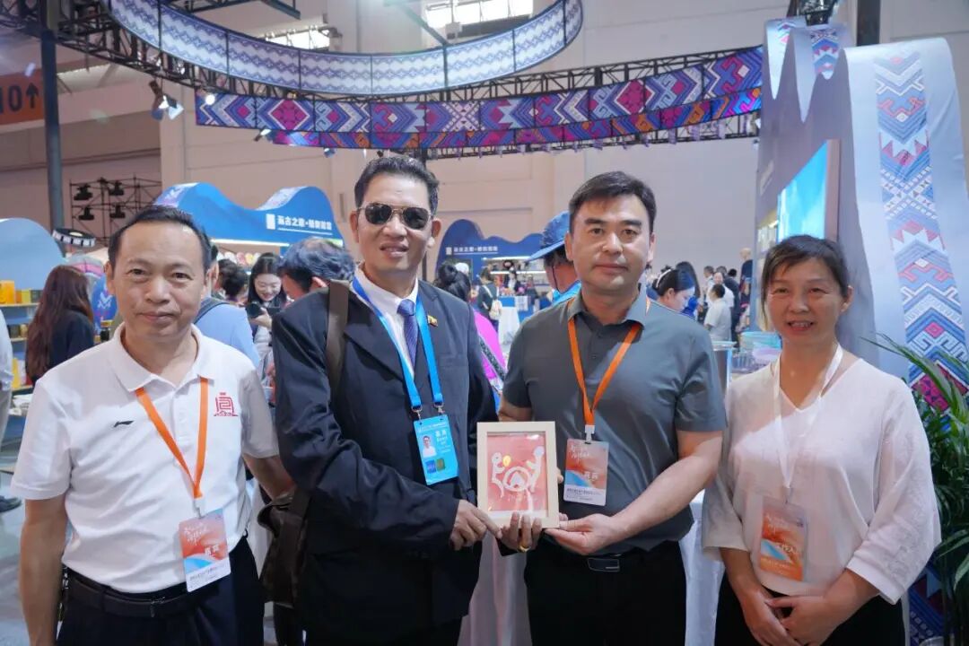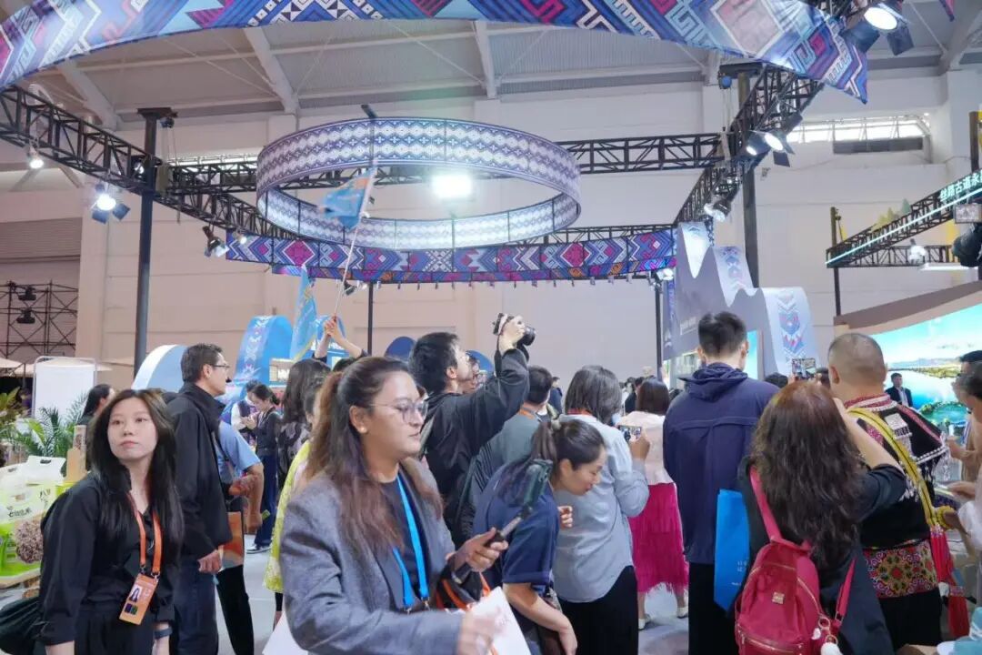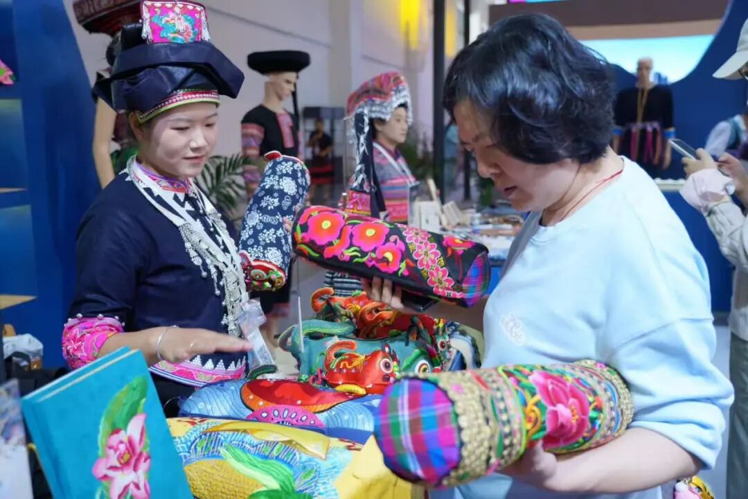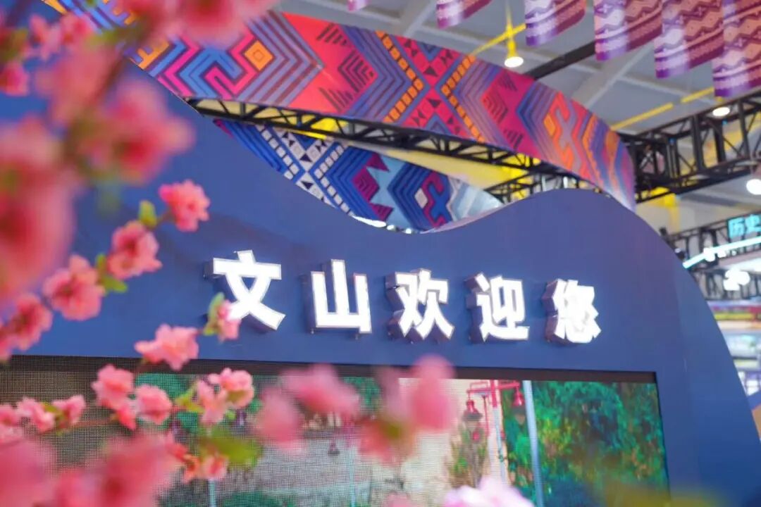 走进文山展区,桃花摇曳、歌舞飞扬,壮锦溢彩、苗绣灵动,文创产品匠心独运。