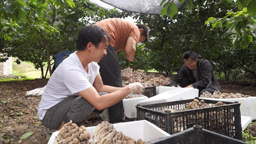 在永仁县维的乡阿者尼村的樱桃树下,村民张启学种植的栎窝菌饱满肥厚,他一边采收着成熟的栎窝菌,一边接听订单电话,今年张启学种了3亩栎窝菌,目前已采收了10吨,实现收入8万元。“我们阿者尼村樱桃树比较多,去年县林草局为我们引进栎窝菌在樱桃树下仿野生种植,长势非常好,出菌率相当高,今年我们村种植栎窝菌面积4亩,目前每两天就要采收1吨左右,预计今年的产值在10.7万元左右,主要销往丽江、攀枝花等地。”维的乡阿者尼村党总支书记熊文庆说道。