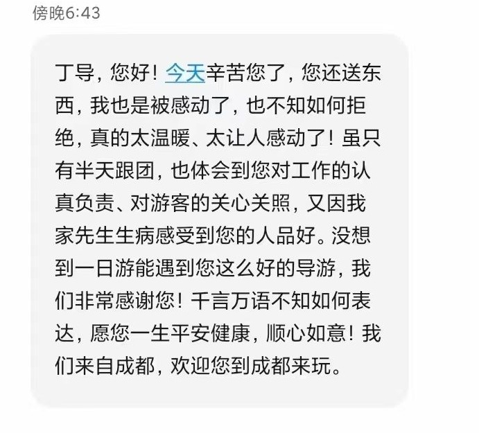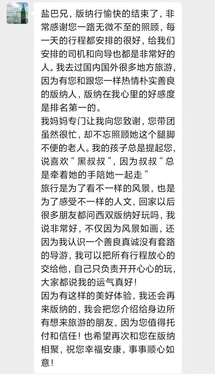 带团时,丁海忠以专业为基、服务为翼,把游客当家人,收到来自天南海北的游客的称赞。在刚结束不久的一个团队中,一名游客便为丁海忠发来了感谢信表示,“非常感谢盐巴兄在西双版纳行中,无微不至的照顾。带团虽忙,但你却不忘照顾我母亲这个腿脚不便的老人。我的孩子也总是提起说喜欢‘黑叔叔’,因为你总是牵着她的手陪她一起走。旅行是为了看不一样的风景,也是为了感受不一样的人文,西双版纳不仅风景如画,正是因为你的善良真诚,让西双版纳在我心里的好感度排名第一,让我们能一路放心游玩,没有多余的担忧。” 这样的好评比比皆是,他也用用细节打破语言隔阂,让每趟旅程都满是温度。
