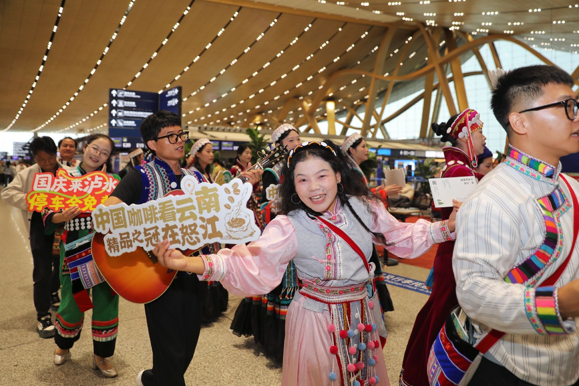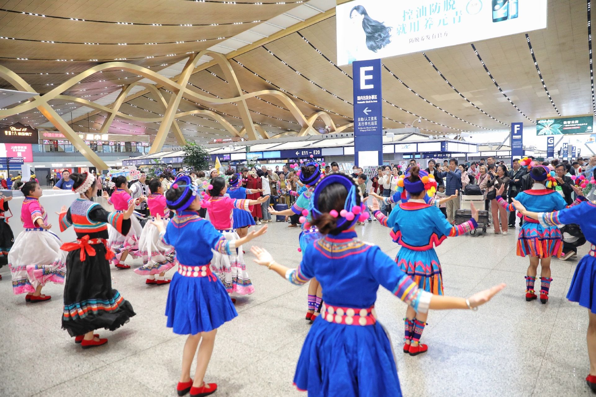 推介会现场不仅有干货满满的信息分享,更有充满怒江特色的精彩节目轮番上演,将现场氛围推向高潮。来自怒江的演员们身着节日盛装,手持印着“国庆来泸水”“怒江219”“泸水的风景缺一个你”的手牌与宣传资料,在机场航站楼内巡回展演宣传。他们主动走近过往旅客,热情递上资料、邀请互动,用真诚笑容拉近与大家的距离。随后,演员们现场开唱《我在泸水很想你》《泸水欢迎您》等朗朗上口的歌曲,熟悉的旋律与真挚的歌词打动了不少旅客;紧接着,富有泸水特色的民族舞蹈打跳节目《户外天堂》精彩亮相,演员们踩着欢快节奏起舞,灵动的舞姿展现出少数民族的热情活力,引得众多旅客纷纷驻足观看,拿出手机拍照打卡,不少人还跟着节奏轻轻晃动身体,沉浸式感受怒江风情。