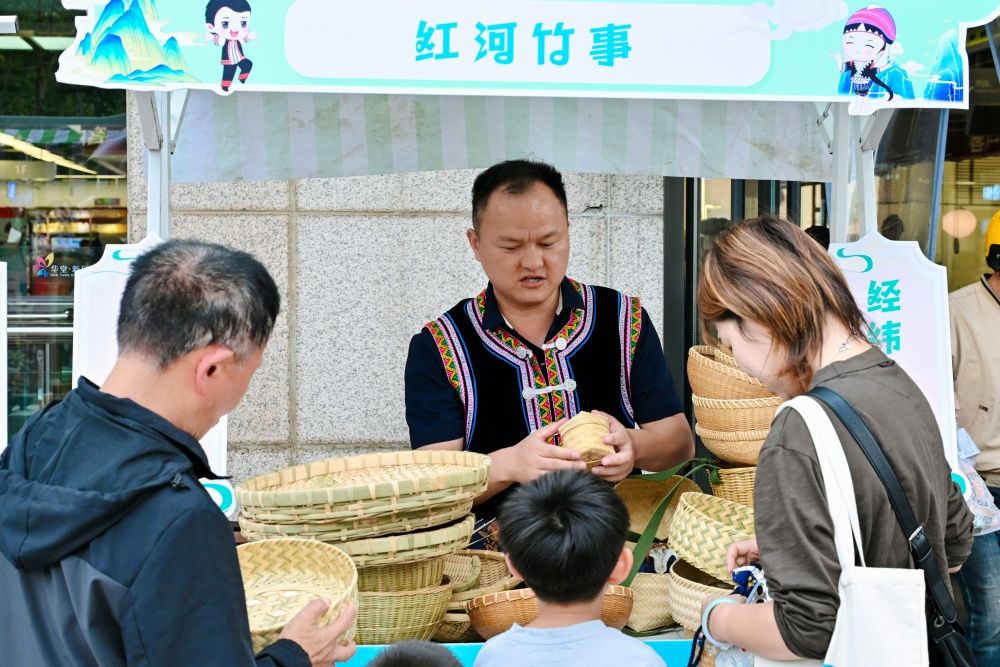 非遗集市更是一座“可触摸的红河文化博物馆”:观众可品鉴历史悠久的建水紫陶与流光溢彩的个旧锡工艺品;轻啖一口哈尼水碾茶,在氤氲茶香中品味红河山水;试戴富有巧思的手工银饰、尝一口刚出炉的石屏豆腐、触摸精巧绝伦的彝族刺绣,更有竹编工坊带头人现场教学,带领大家亲手体验传统竹编技艺。这不仅是一次非遗进京的活动,更是一场穿越三千公里的文化奔赴,让首都民众在口耳眼舌之间,读懂红河千年传承的山水密码。