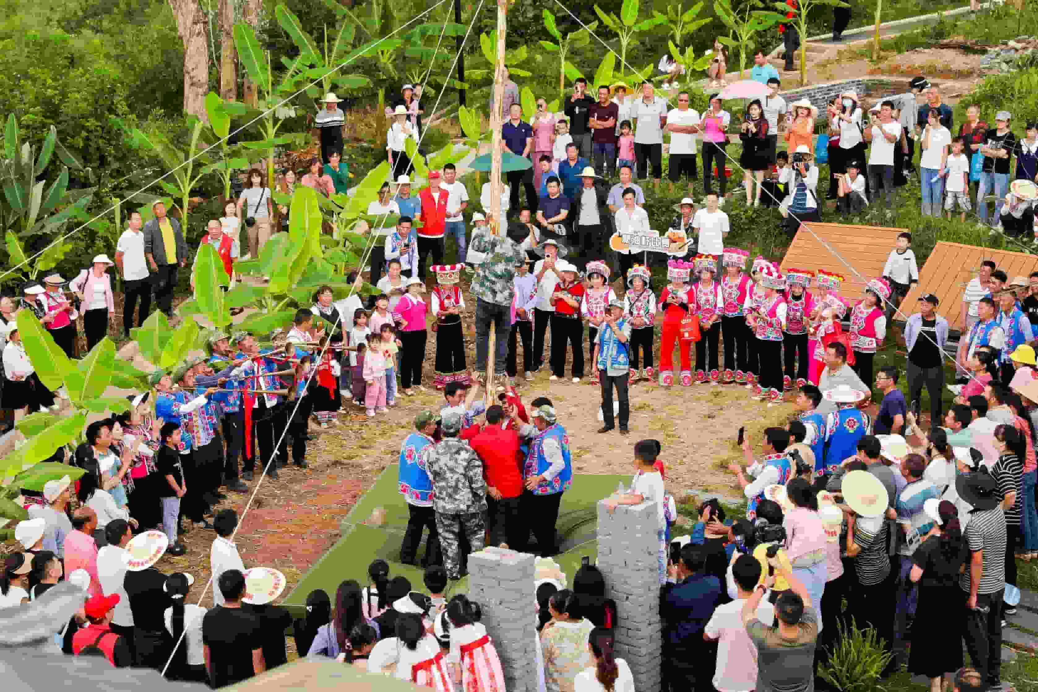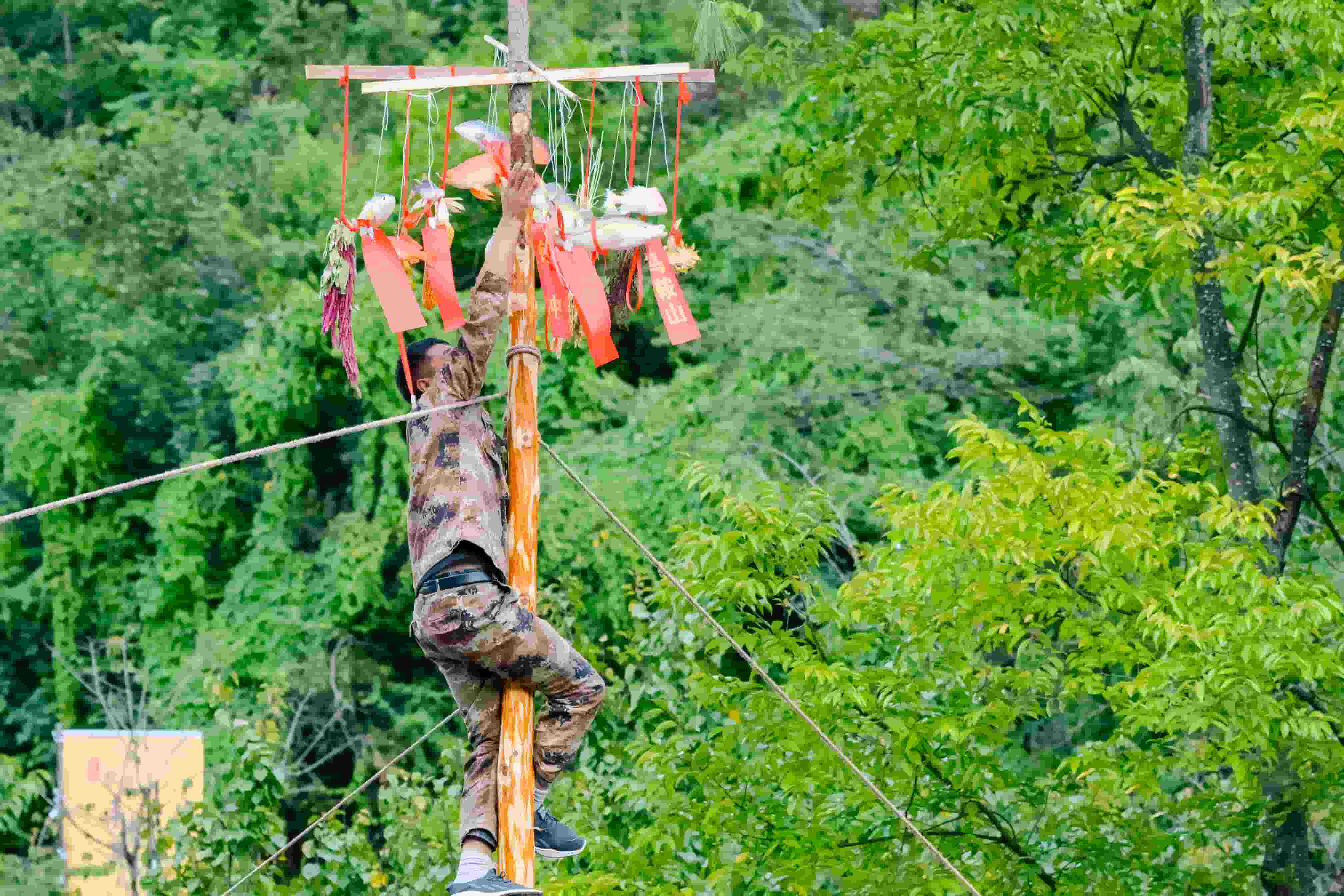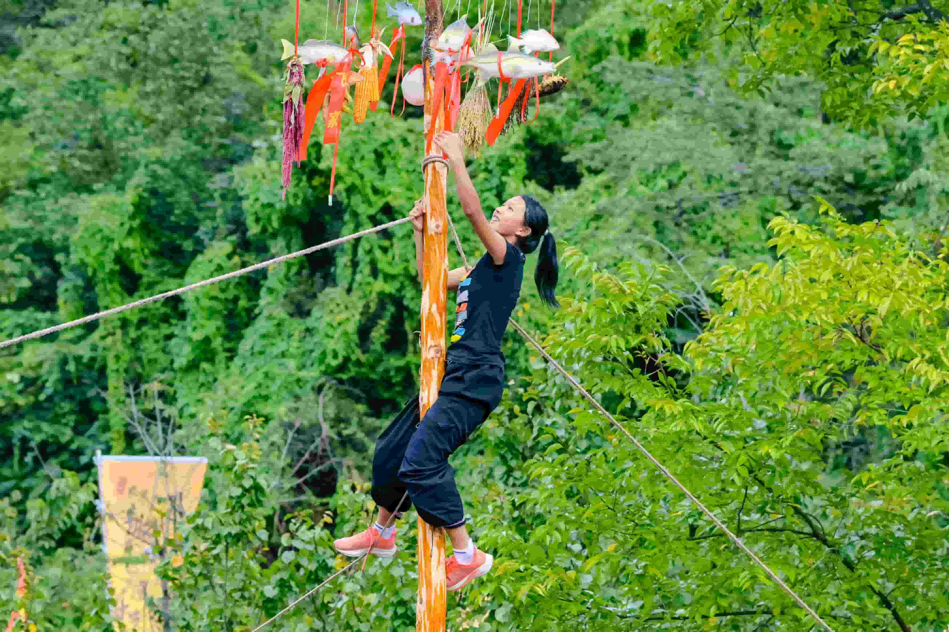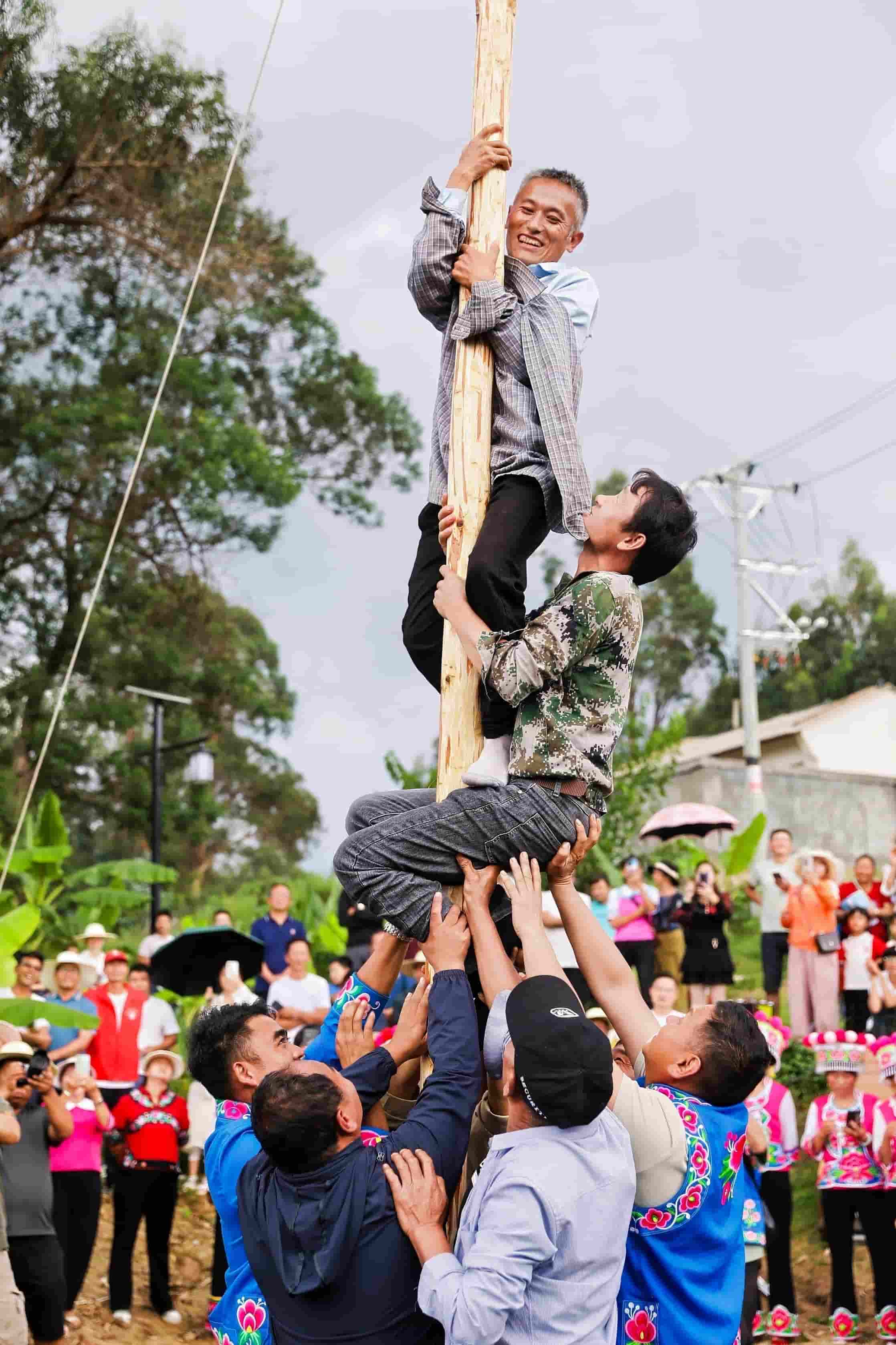 欢快的月琴弹起来,惬意的三跺脚跳起来。“呜~呜~呜~”在震撼的长喇叭声中,迎来一队膀大腰圆身穿黑衣的彝族同胞,中间竟有一位“花木兰”,只听哨声一响,五大汉扶肩托脚,她抓紧油杆蹭蹭往上爬,工具人快速跟上,“花木兰”像只爬树的猴一窜老高,她仅用脚踩了工具人肩头两下,全凭自身敏捷和柔韧几个挪腾就用左足尖勾住了杆顶绳子。“加油、加油····”全场顿时被她精湛的技艺和精彩的表演给镇住了!说时迟、那时快,她抱紧油杆欺身而上,快速用右膝盖压住另一端系杆绳,站稳后迅雷不及掩耳抢下物件。喝彩声、欢呼声、雷鸣般的掌声,身手如此了得?女中豪杰!真可谓是“巾帼不让须眉”!女子也能顶半边天…… 喜欢云南,喜欢南华,喜欢这些乐翻天、接地气的节目!既保留原汁原味,又可以恣意放肆,歇斯底里的疯玩疯笑……这不就是生活的真谛吗?这不就是云南人民共同谱写民族团结、乡村振兴、和谐共生的新篇章吗?