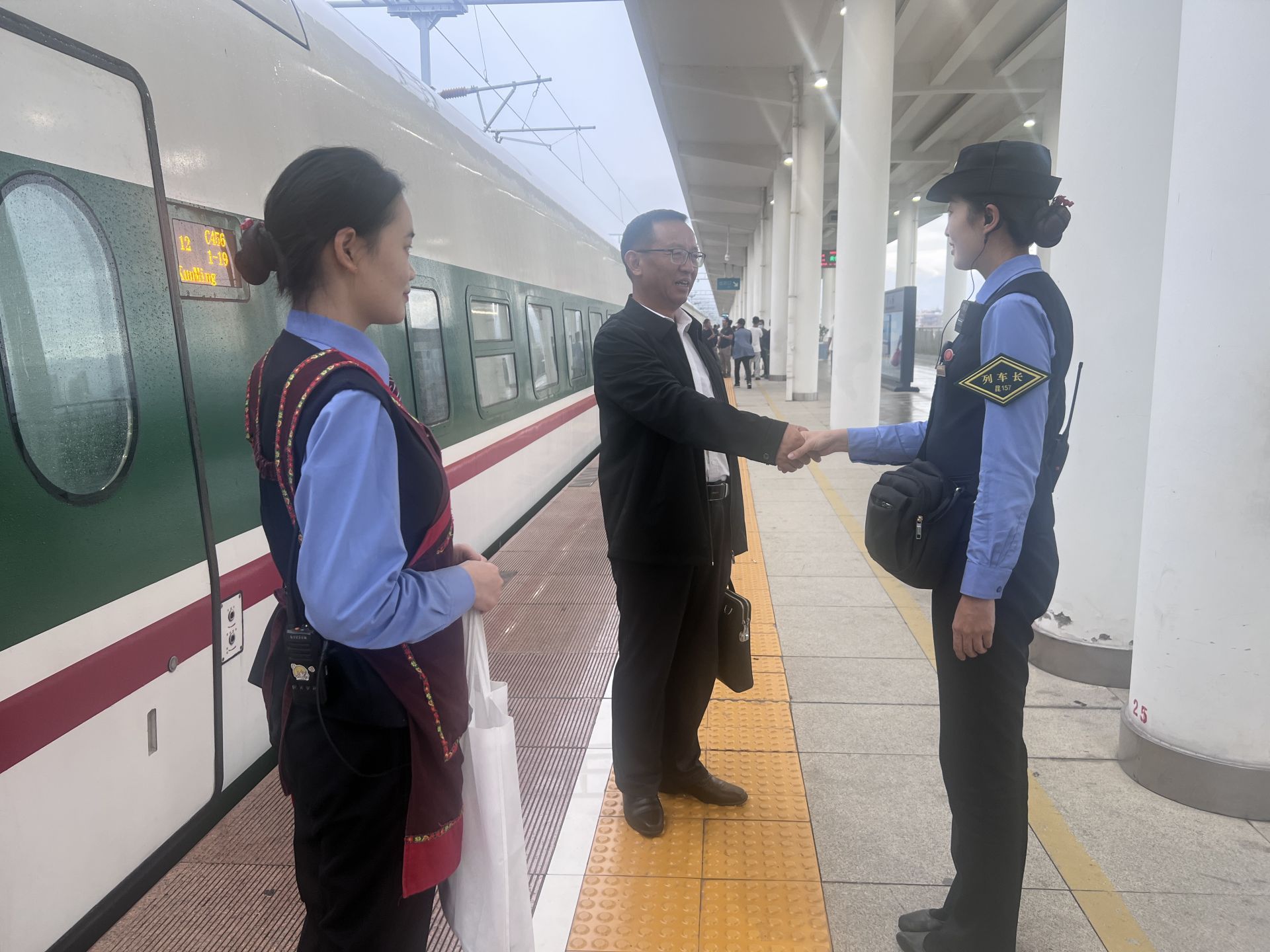 当列车抵达祥云站时,张先生紧紧拉住陈燕的手,语气激动:“在我最难受的时候,你及时伸出援手,这份服务不仅解了我的出行难题,更把社会的温暖传递到心里,太感谢了!”