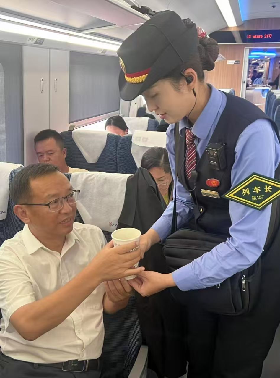 整个行程中,车长陈燕始终牵挂着张先生的状况,不时到座位旁查看,主动送来茶水与糖水,用耐心和细心一点点缓解他的不适。这份无微不至的照料,不仅让张先生倍感温暖,也打动了周围旅客。
