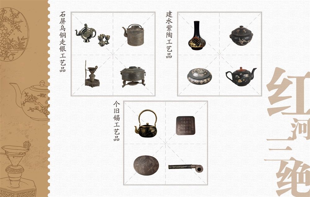 红河州的非物质文化遗产石屏乌铜走银制作技艺、建水紫陶烧制技艺和个旧锡器制作工艺有“红河三绝”之美誉。10月3日,观众朋友将在博物馆内拍摄到的“红河三绝”的三种手工艺品的图片(至少各一张),并在微信中进行分享,将分享界面展示给服务台工作人员后,即可获赠一份节日礼品。