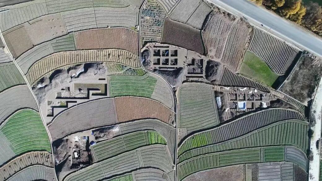 (剑川县海门口遗址航拍,遗址核心区从图中丁字路口周围展开)