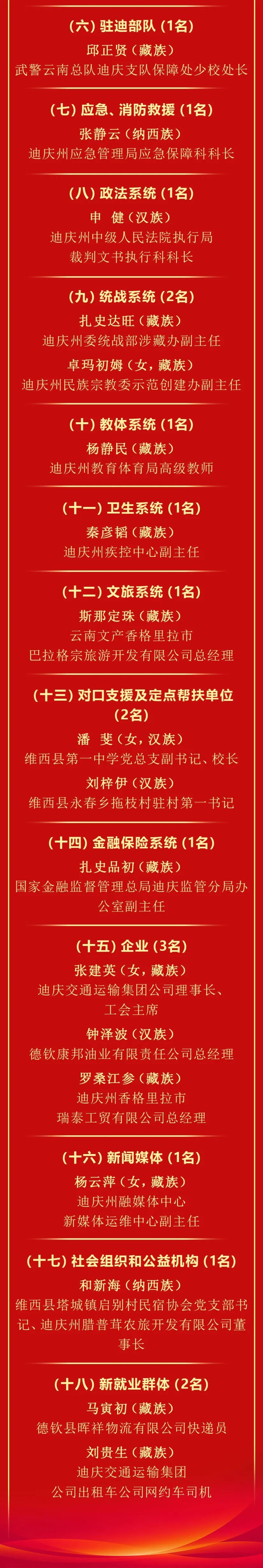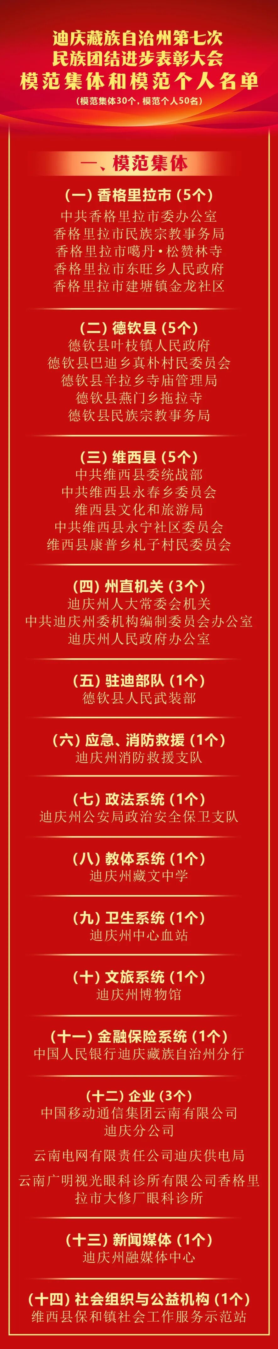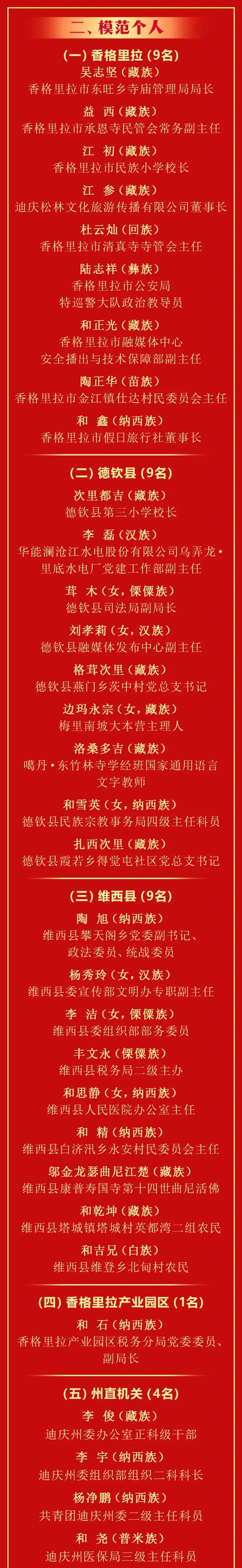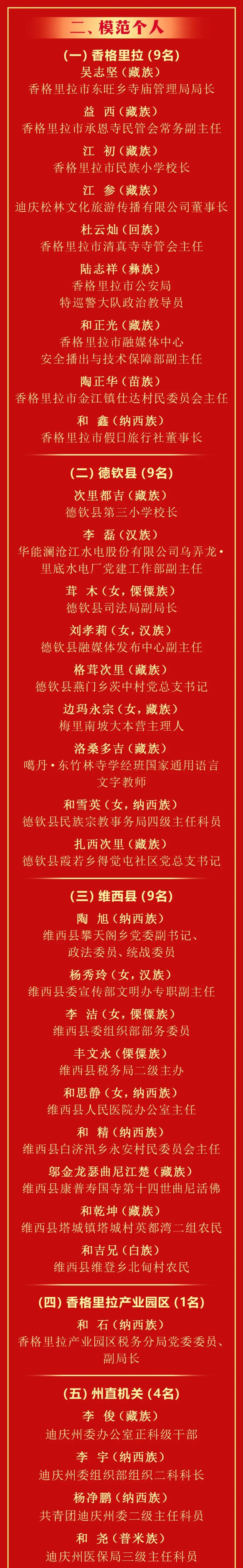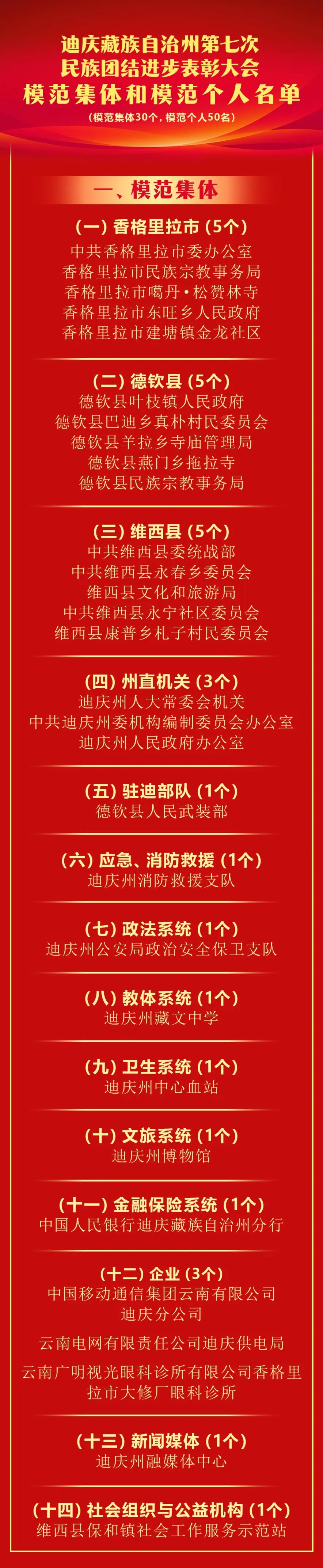 2020年我州第六次民族团结进步表彰大会以来,全州各级各部门和各族干部群众坚持以习近平新时代中国特色社会主义思想为指导,深入践行新时代党的治藏方略,全面贯彻落实习近平总书记关于加强和改进民族工作的重要思想和考察云南重要讲话精神,紧扣省委“3815”战略发展目标,纵深推进民族团结进步示范区建设,成功创建全国民族团结进步示范州,涌现出了一大批坚持以铸牢中华民族共同体意识为主线,为全州民族团结进步事业作出突出贡献的模范集体和模范个人。为表彰先进、树立典型,促进各族干部群众共同团结奋斗、共同繁荣发展,州委、州政府决定授予30个集体“全州民族团结进步模范集体”称号,授予50名个人“全州民族团结进步模范个人”称号。