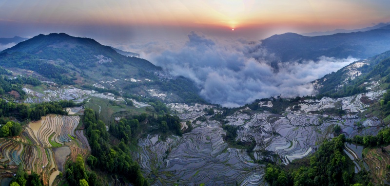 当北纬23°的阳光穿过层层云海,轻抚海拔1314米的爱情坐标,便写下了一封天地为证的情书。红河——这个名字,本身就如一句心动告白,在云贵高原南麓舒展成3.29万平方公里的浪漫史诗。这里,梯田溢彩、古城婉转,万物有灵,山海含情,成为爱意自然滋长的天堂。
