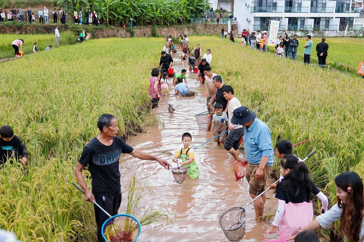 最受瞩目的莫过于割稻和摸鱼比赛。田埂上,镰刀翻飞,金黄稻谷应声倒下,空气中弥漫着稻香;水田里,孩子与大人齐上阵,水花四溅,笑声不断。稻田成为舞台,农人化身演员,丰收的场景以最质朴的方式被重新演绎。“这些活动让我们在欢乐中找回了农耕记忆,也让游客感受到了农业的厚重与鲜活。”村民杨大姐说。