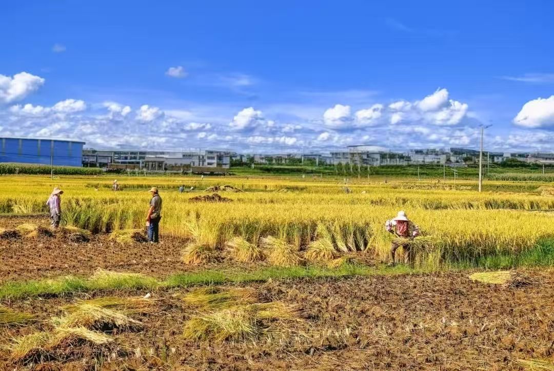 楚雄鹿城、禄丰金山镇等坝区的稻田间,收割机轰鸣着穿梭在金色稻海,各族群众自发组成的“互助小分队”活跃在田埂上。有人搭手搬运装满稻穗的箩筐,有人耐心指导游客体验手工打谷,田边悬挂的“中华民族一家亲,同心共庆丰收年”横幅格外醒目。大家不分你我,主动分享农耕经验、补位帮忙;有人照看孩童,有人准备午饭,每一个忙碌的身影都交织成“团结协作”的画面,既让收割效率大幅提升,更让彼此的心在劳作中贴得更近。