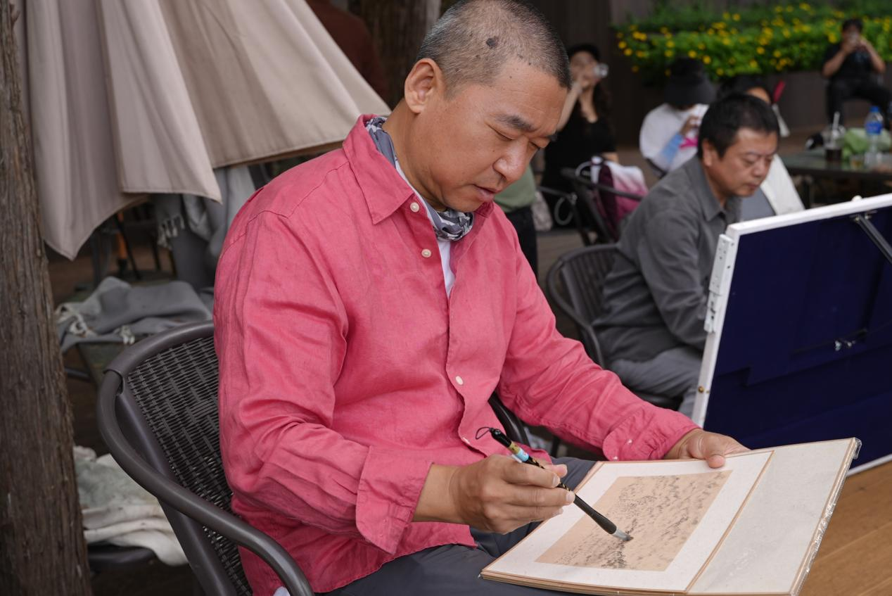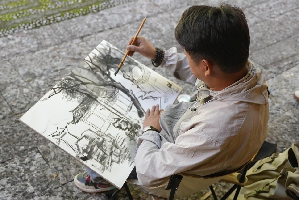 在黑龙潭的写生现场,中国艺术研究院博士、李可染画院终身研究员聂松教授的创作方式独树一帜。与其他画家不同,他始终使用极浅的淡墨作画,画面如薄雾轻笼,却层次分明,墨色具亲和力。淡墨看似简单,实则需要深厚的功底支撑。聂松解释道:“这需要从书法开始积累手上力道。下笔时墨虽淡,但要力透纸背。”在他的笔下,远山近水、亭台树木,皆以极其精微的墨色变化展现,仿佛将丽江的灵秀之气轻拢慢捻,化作纸上烟云。