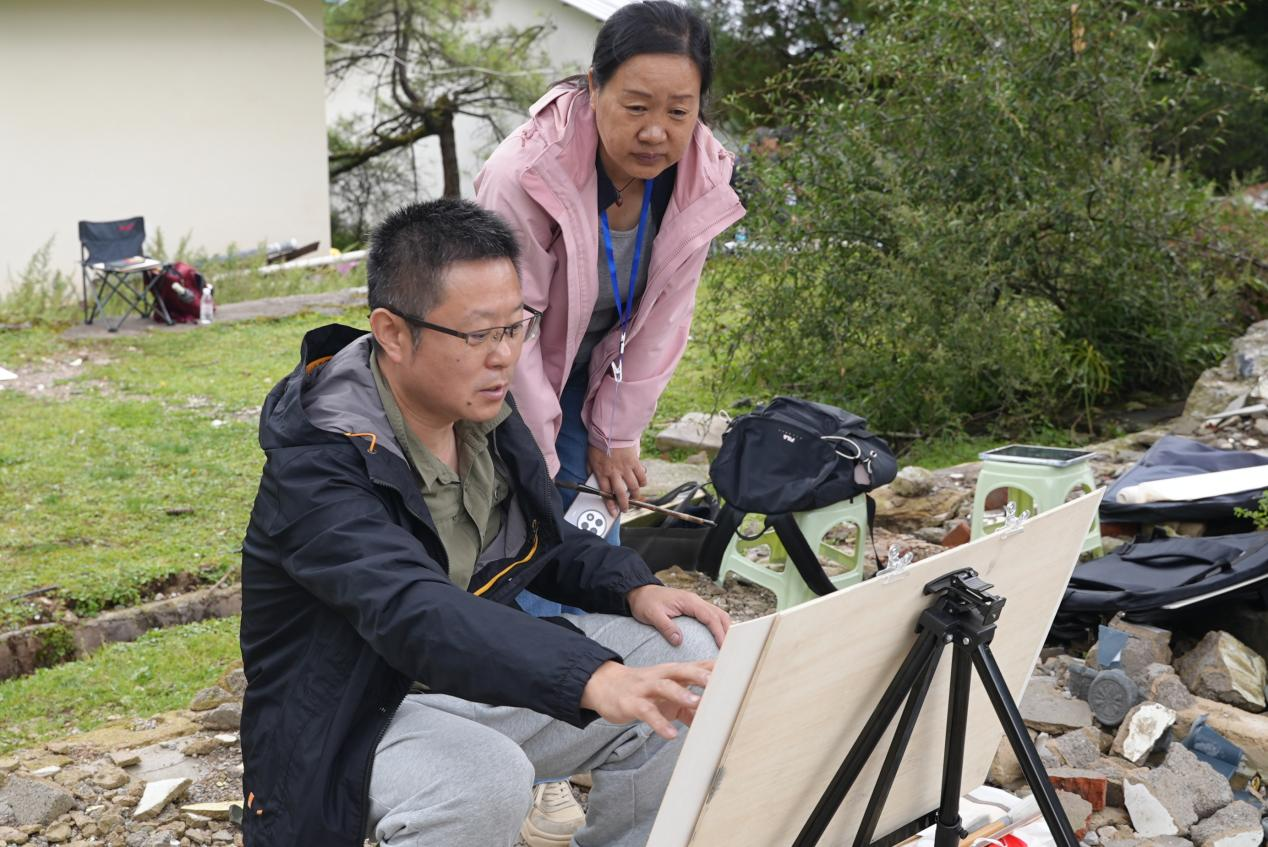 宁蒗县学员徐豪龙作为一位连续多次参加活动的学员,此次写生也有了新的体悟和尝试。“聂老师让我明白,画作最重要的是表达内心感受。”一直以油画见长的他,这几天也开始尝试用毛笔作画,提到新的尝试,他说:“虽然技法生疏,但通过淡墨的运用,我找到了新的艺术表达语言。聂老师说‘画自己所想的’,这句话让我受益匪浅。”