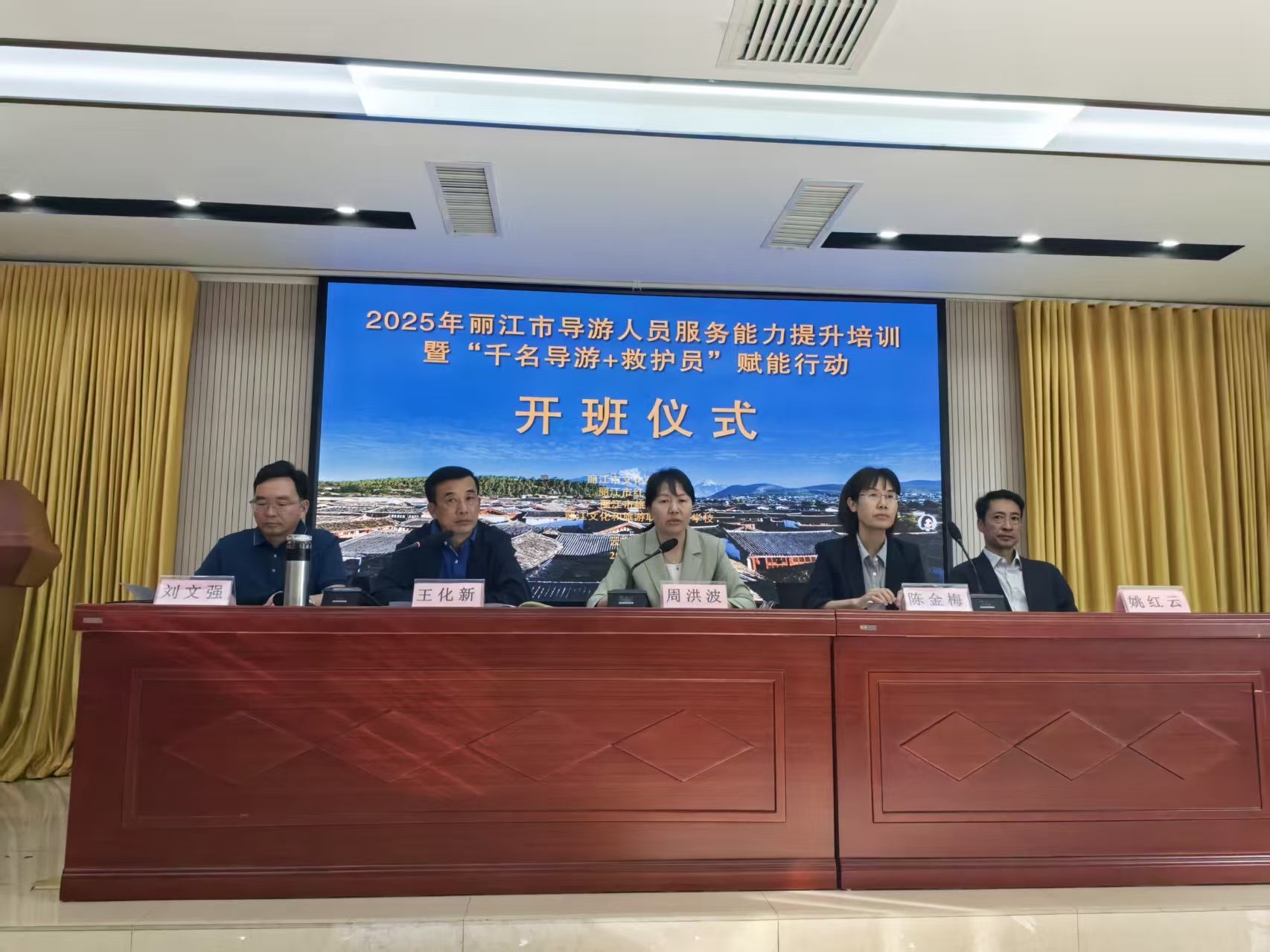 丽江市旅游协会会长王化新主持仪式,市文化和旅游局党组成员、副局长周洪波作开班动员讲话,市红十字会常务副会长陈金梅、授课老师代表及参培学员代表分别作发言。