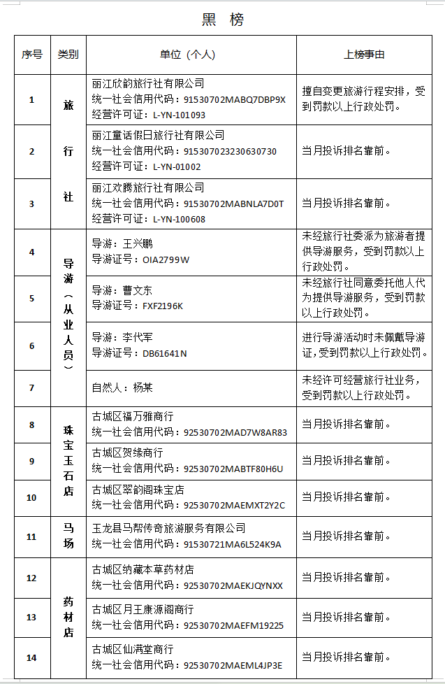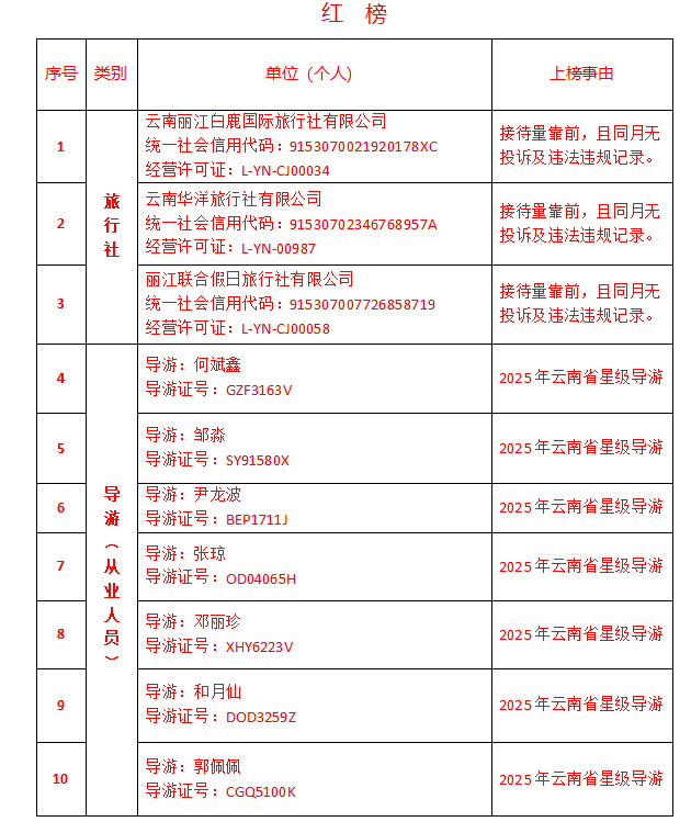 2025年第8期丽江文旅“红黑榜”公布 2025-09-29 10:16 0 9月29日,2025年第8期丽江文旅“红黑榜”公布,共10个单位(个人)上红榜,14个单位(个人)上黑榜。 来源:丽江市文化和旅游局 责编 李舒琪 校对 张楠 审核 华芳 终审 李文女