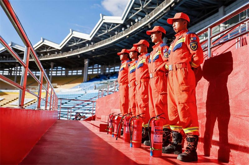 全省抽调的20余名专业裁判员,经过专项培训后执裁,确保比赛公平有序;场地保障团队提前完成草坪养护、器材购置、布置功能用房,确保赛场达到国际标准;后勤接待团队以“点对点”服务衔接参赛队伍抵离、食宿,6名翻译志愿者打通语言壁垒;医疗与食品安全团队24小时值守,赛场和驻地酒店有救护车、医护人员待命;市场监管部门全程监督食材采购与加工,筑牢健康防线;公安、应急、消防等部门多轮隐患排查、开展消防演练,动态部署警力维护秩序……这些幕后英雄用细致的工作,筑牢了赛事的安全防线。
