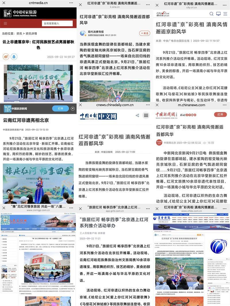 线上传播,全域覆盖。此次宣传推介活动通过现场图片直播、图文报道、短视频等多种形式,带着全国网民“云参与”,形成了多层次、广覆盖的传播矩阵。活动得到了人民日报、中央广播电视总台、经济日报、中新社、中国日报、光明日报、环球时报、新华网、中国网、国际在线、央广网、中国青年报、农民日报、消费时报、工人日报、《中国国家旅游》杂志、北京日报、湖北日报、湖北广播电视台、河南日报、河南广播电视台等省外媒体,云南日报、文旅头条、云南红河发布等省内媒体,共计60多家央、省、市级主流媒体的大力支持,聚焦红河文旅特色和非遗亮点,报、台、网、端、微等媒体渠道齐发力。截至目前,全网曝光量超6000万。