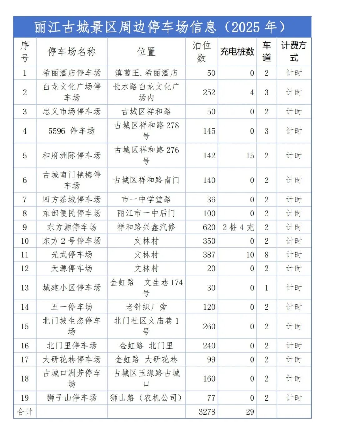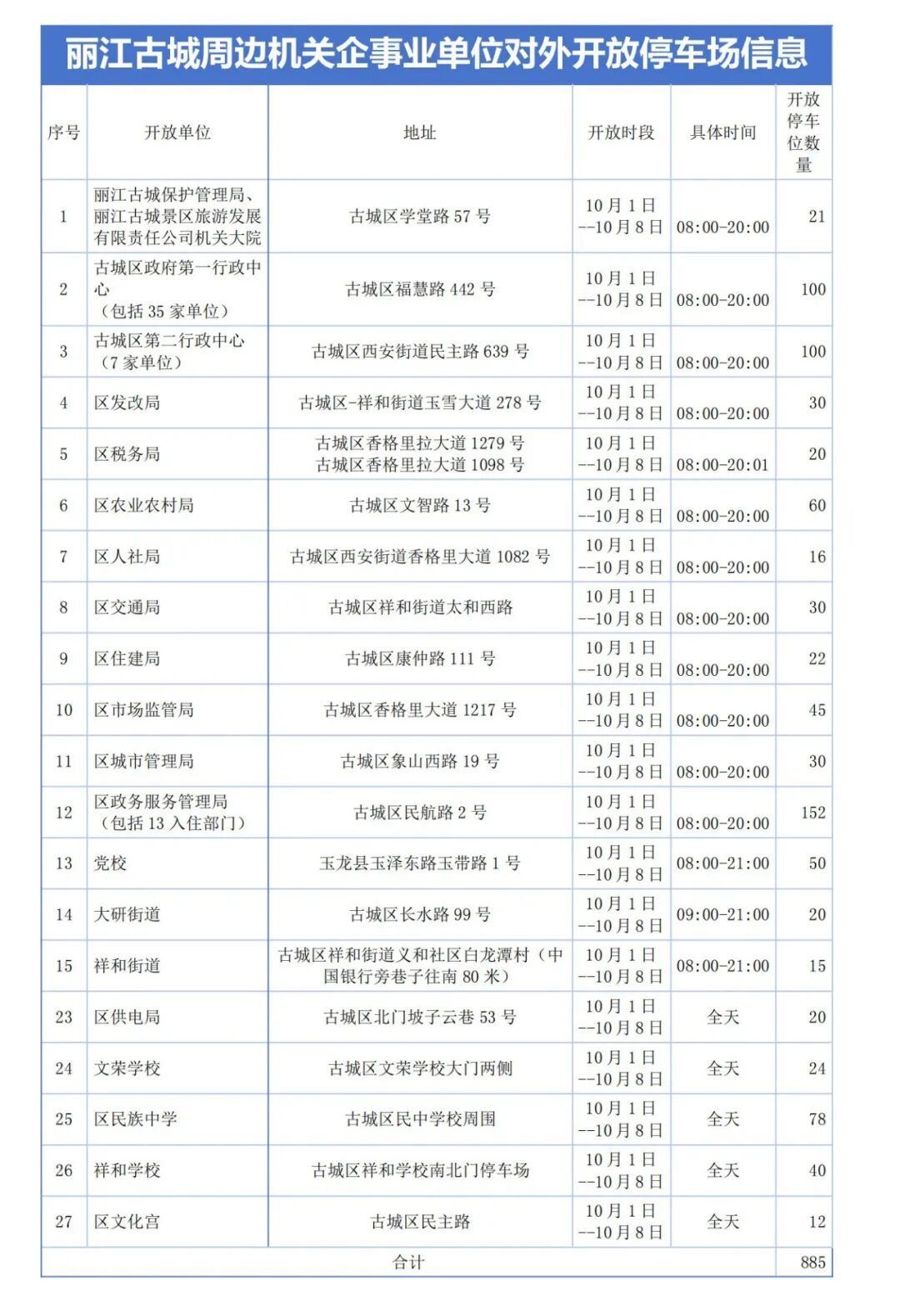 节假日期间,丽江古城(大研区域)周边27个行政机关企事业单位提供免费停车,同时有近20个计时付费停车场提供3000多个停车位,自驾游车主可导航前往。