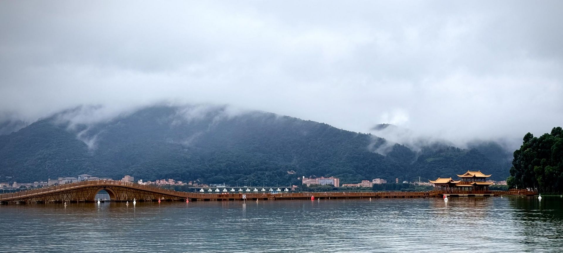 当天上午,细雨蒙蒙中,不少市民满怀期待冒雨而来,只为抢先感受开合浮桥带来的全新体验。烟雨中,这座以画舫为灵感设计的七孔浮桥串联起碧波万顷,与大观公园中的大观楼、石画舫遥相呼应,成为草海上的新景观。10时,无人机撒下玫瑰花雨,浮桥正式开放。