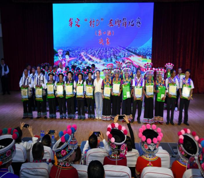 10月1日,牟定县“村D”左脚舞首场比赛热闹开赛,19支代表队齐聚赛场,以欢快舞姿献礼国庆76周年。