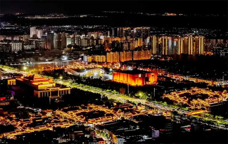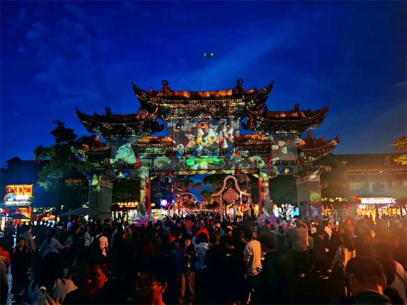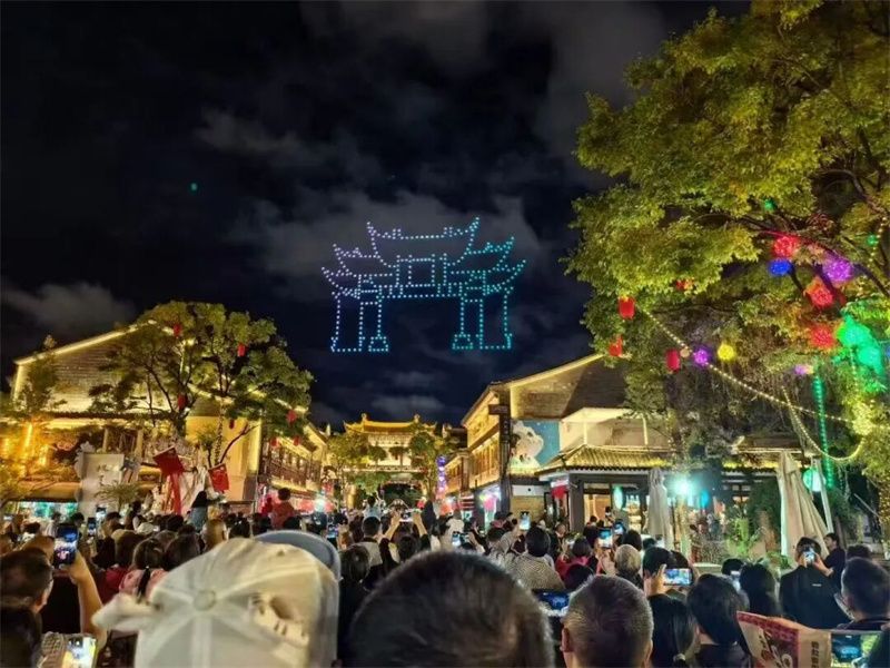夜幕降临,古镇迎来高光时刻。百余架无人机腾空,在夜空组成“官渡欢迎您”“官渡牌坊”“金刚塔”等图案,与地面渔灯交相辉映,游客纷纷举机记录震撼场景。国庆主题灯光秀以古镇牌坊为“画布”,用投影技术展现官渡从古渡繁忙到现代繁华的变迁,光影与音乐结合,让游客直观读懂古镇历史。