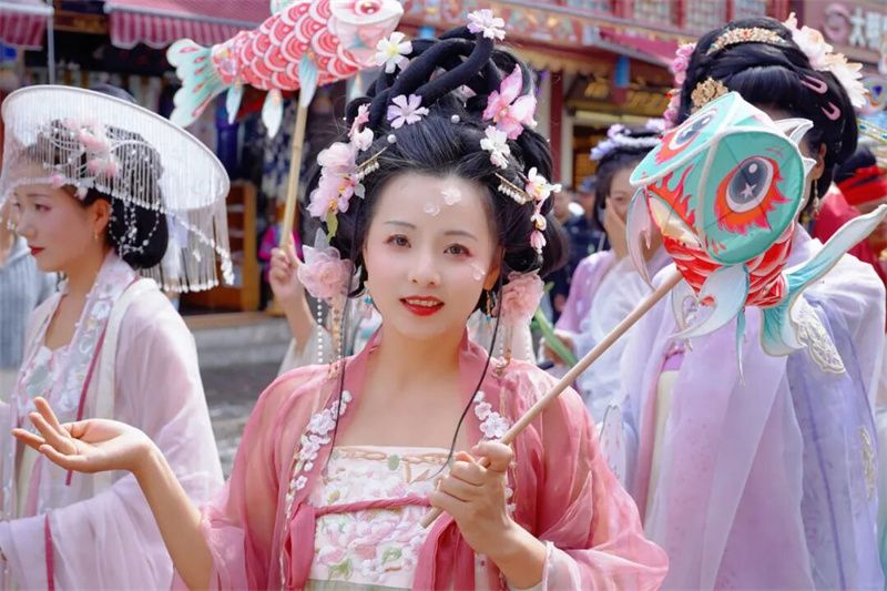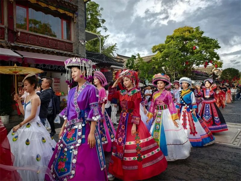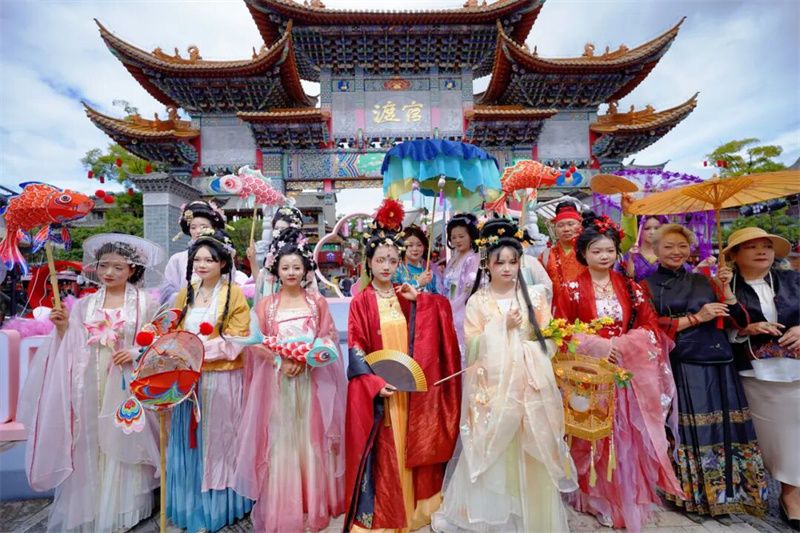 快闪过后,三大主题巡游轮番登场。民族巡游率先启程,云南各族表演者身着绚丽盛装,从广福路牌坊主舞台出发,彝族绣花头饰、傣族孔雀裙摆、白族扎染围裙相映成趣,伴着民族乐曲载歌载舞,尽显“多元一体”的民族风情,游客纷纷跟拍记录热闹瞬间。