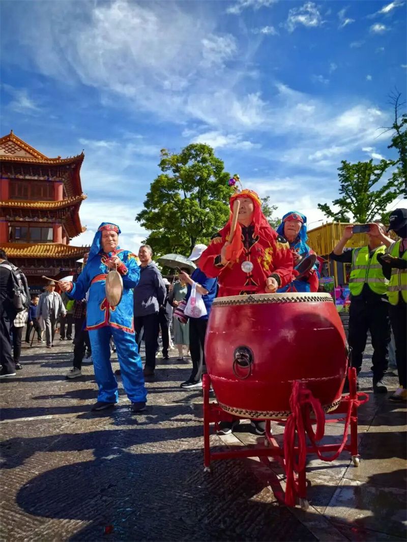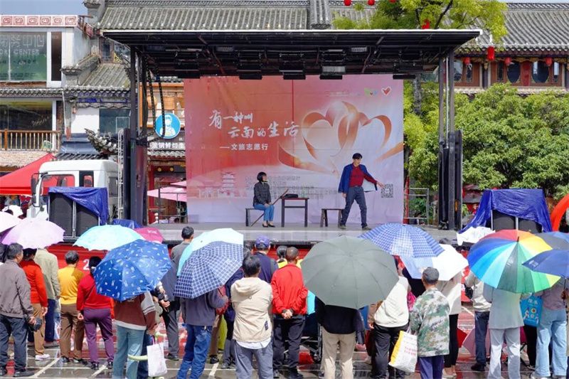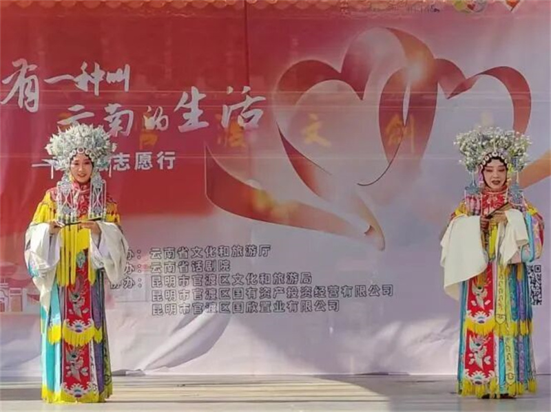 主舞台区域“好戏连台”,从早到晚精彩不停。传统滇剧与花灯表演是重头戏,老艺术家演绎的《三击掌》字正腔圆,《探干妹》诙谐生动;新生代演员同台献艺,将现代表演技巧融入传统剧目,让两项非遗焕发新生。“文旅志愿行”活动同样亮眼,话剧片段引人入胜,川剧变脸惊艳全场,舞蹈与歌曲演唱互动频繁,欢声笑语满古镇。