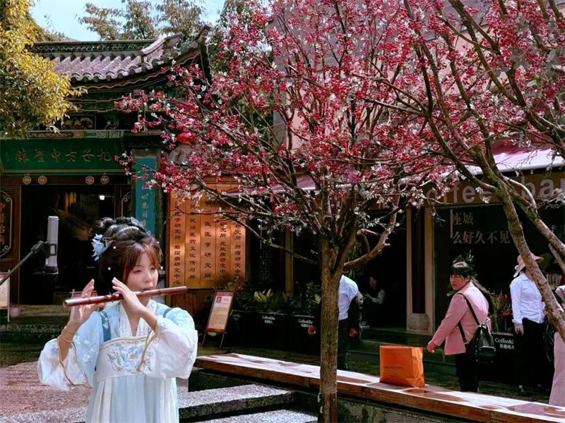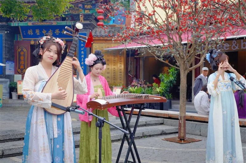 九转花街的古风体验区,是“穿越古今”的绝佳去处。古风乐坊处,演奏者身着汉服,在亭台间弹奏琵琶、古筝、笛子,《春江花月夜》《高山流水》的悠扬乐声,让游客沉醉其中。国风舞蹈表演更令人惊艳,舞者身着秦汉曲裾、唐代齐胸襦裙、明代袄裙,广袖翻飞间展现传统服饰之美与礼仪之盛,不少游客上前合影留念。