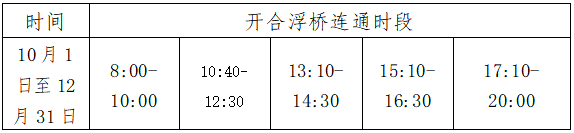 2.东风坝浮桥在试运营期间,周末及节假日开放时间为08:00至20:00。为统筹船舶通航与行人通行需求,浮桥将在此期间分时段连通,具体安排如下: