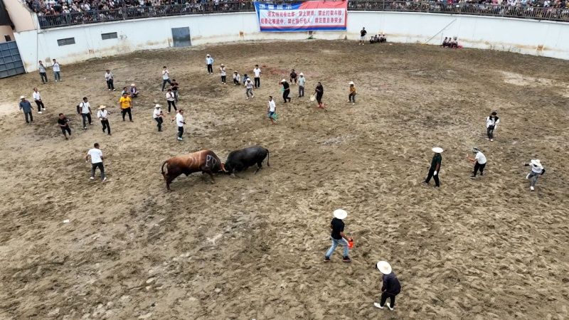 当天最受瞩目的“压轴大戏”,是名牛单挑赛——湖南牛王“西楚霸王”对阵“新时金刚”。两头猛牛狭路相逢,场上角力激烈,攻势如潮,引得观众惊呼连连。激烈缠斗后,“新时金刚”最终凭借强劲的爆发力锁定胜局,赢得现场雷鸣般的掌声,为首日赛事画下圆满句号。