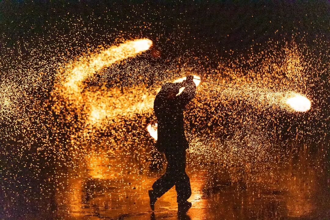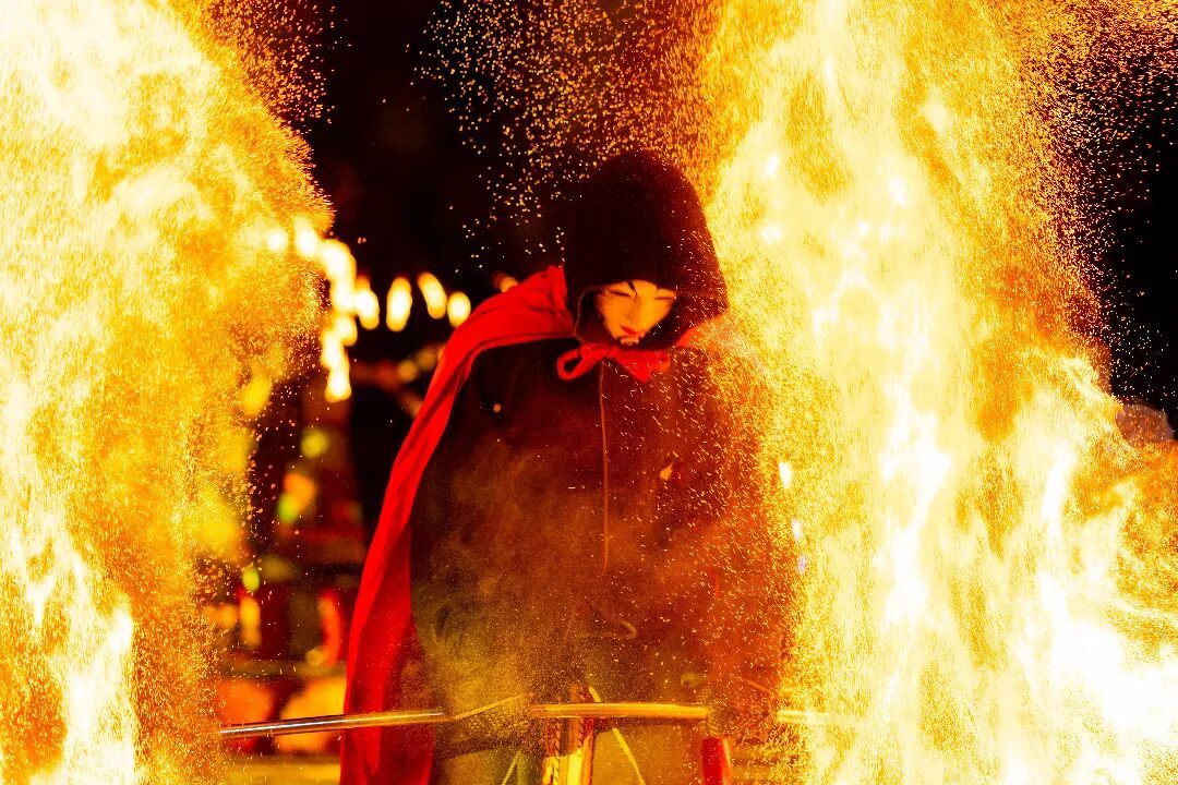 驭火奇技、铁花泼空,火人狂欢盛宴燃出千般焰色。火魔方飞旋火星四溅,火刀裂空长焰如龙,火壶流光燃烧千年一梦……汇聚各种非遗绝技的火秀奇观,让游客们目眩神迷。