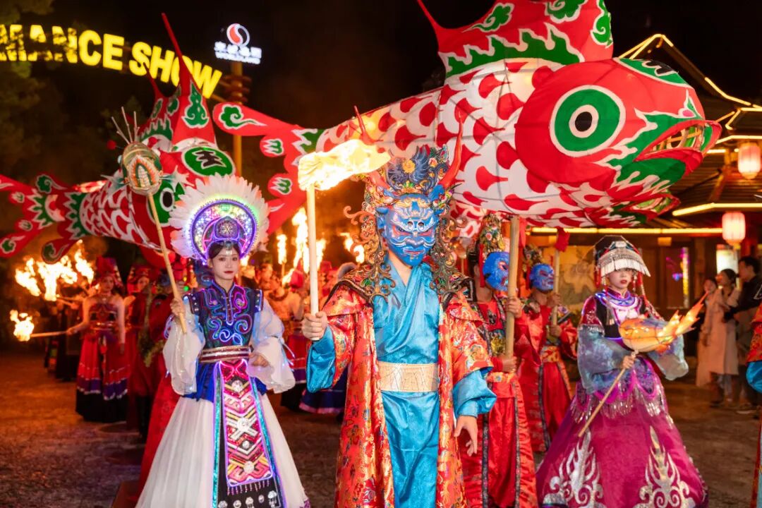 傩面狂欢,火把成行,各少数民族阿哥阿妹盛装巡游,踏焰祈福、随火而舞,共燃此刻绚烂,整个景区仿佛化身为炽烈的火之国度。