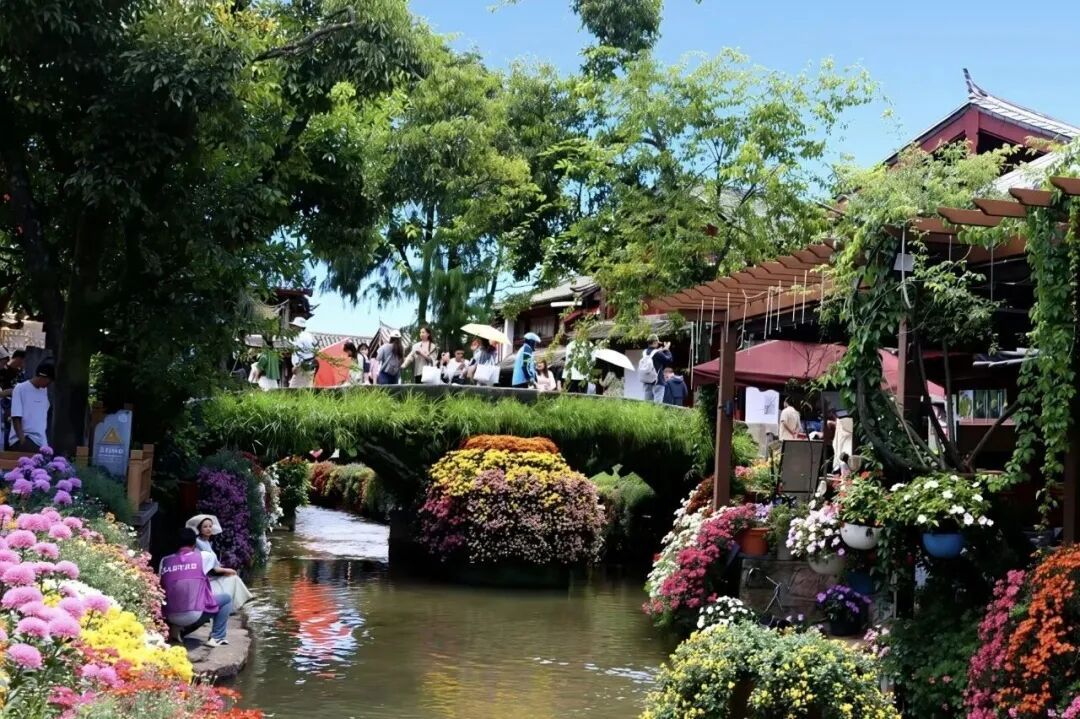 古城内布置了3万余盆菊花,涵盖400多个品种,色彩斑斓、形态万千,“舍不得的丽江”“和和美美”“庆丰收”“平安喜乐”等10组主题花卉造景错落有致,令人流连忘返。