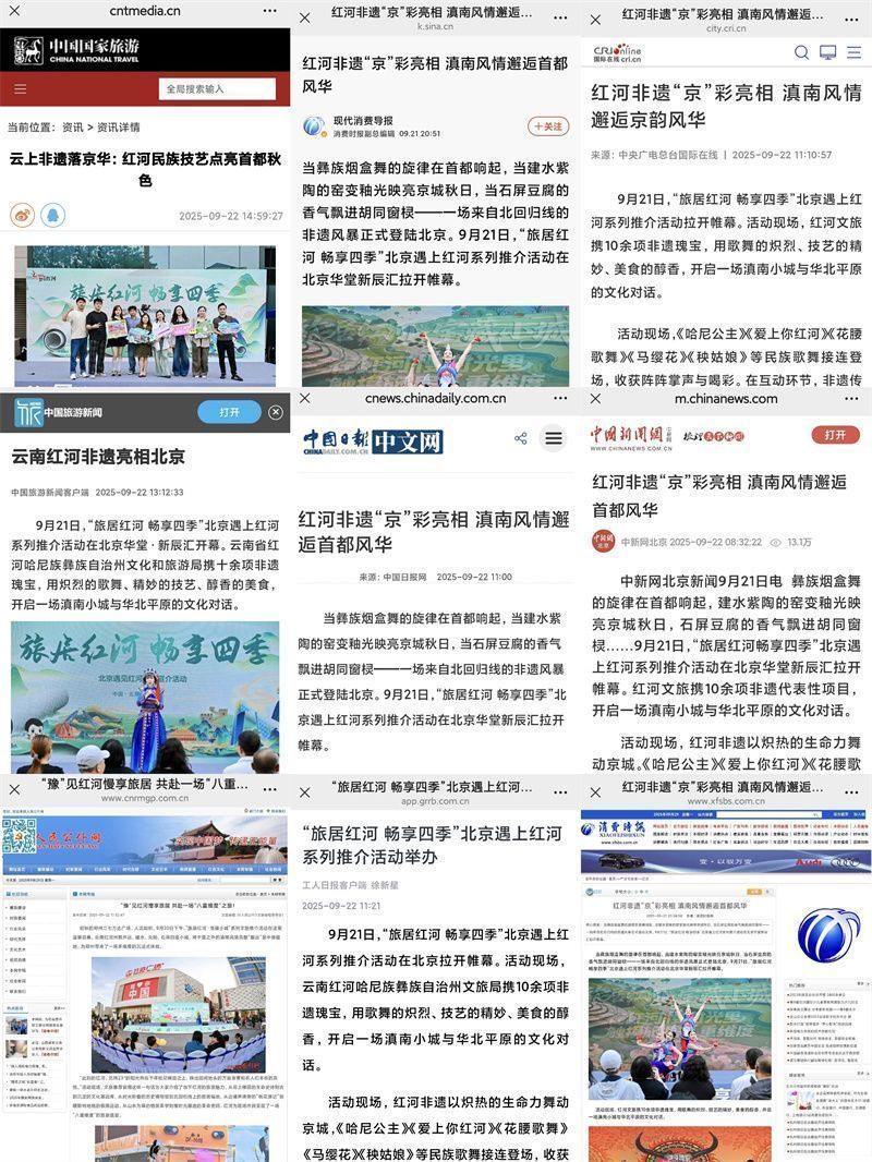 9月中旬,红河州文化和旅游局将独特的非遗、民族文化与旅居资源,先后带到武汉、郑州和北京,开展了一系列别具一格的文旅推介活动。从武汉、郑州的“八重维度”之旅,再到“北京遇见红河”,红河以其独特的魅力深度展示“旅居红河 宝藏小城”,掀起了一股“红河热”。活动中非遗展示、风物集市、歌舞展演、美食体验、歌舞快闪等活动,让现场群众沉浸式体验了红河的魅力。同时,通过现场图片直播、图文报道、短视频等多种形式,带着全国网民“云参与”,形成了多层次、广覆盖的传播矩阵。活动得到了人民日报、中央广播电视总台、经济日报、中新社、中国日报等60多家央、省、市级主流媒体的大力支持,全网曝光量超6000万,为双节假期引客入“红”起到了积极宣传作用。