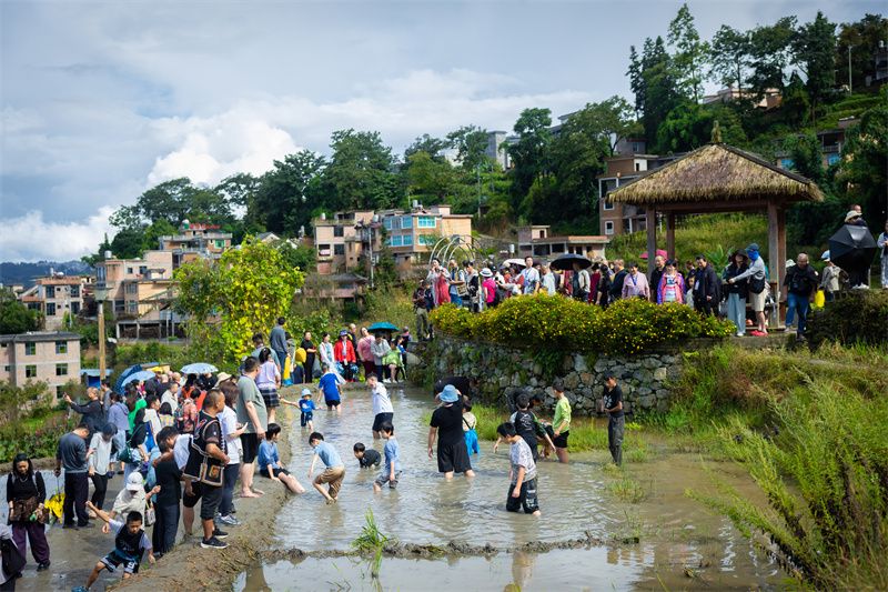 国庆假期,红河县龙玛村持续开展“村长有请”活动,摸鱼、套鸭子、骑马、舂粑粑、梯田走秀、长街宴等民俗活动吸引了全国各地的游客前来参与,体验做红河“新村民”,感受田园生活乐趣。