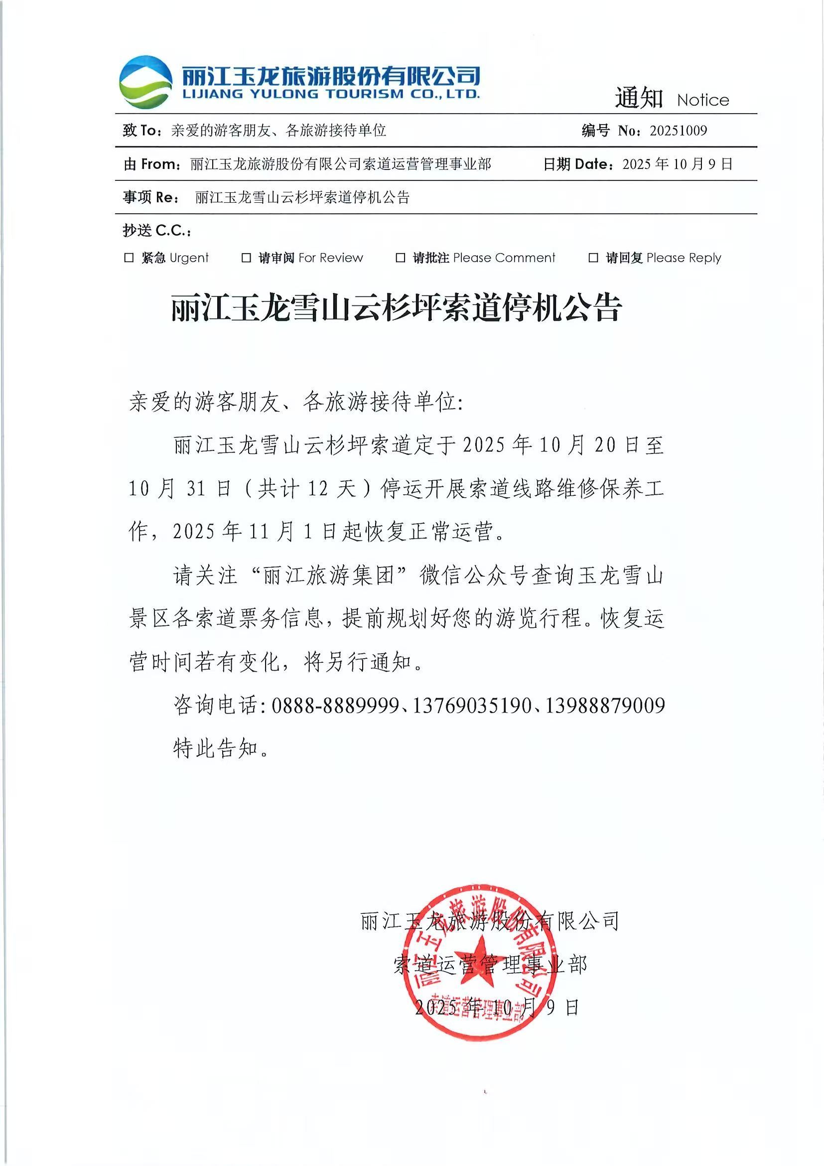 10月9日,丽江玉龙旅游股份有限公司索道运营管理事业部发布公告,玉龙雪山景区云杉坪索道将于10月20日至10月31日(共计12天)停运开展索道线路维修保养工作,11月1日起恢复正常运营。