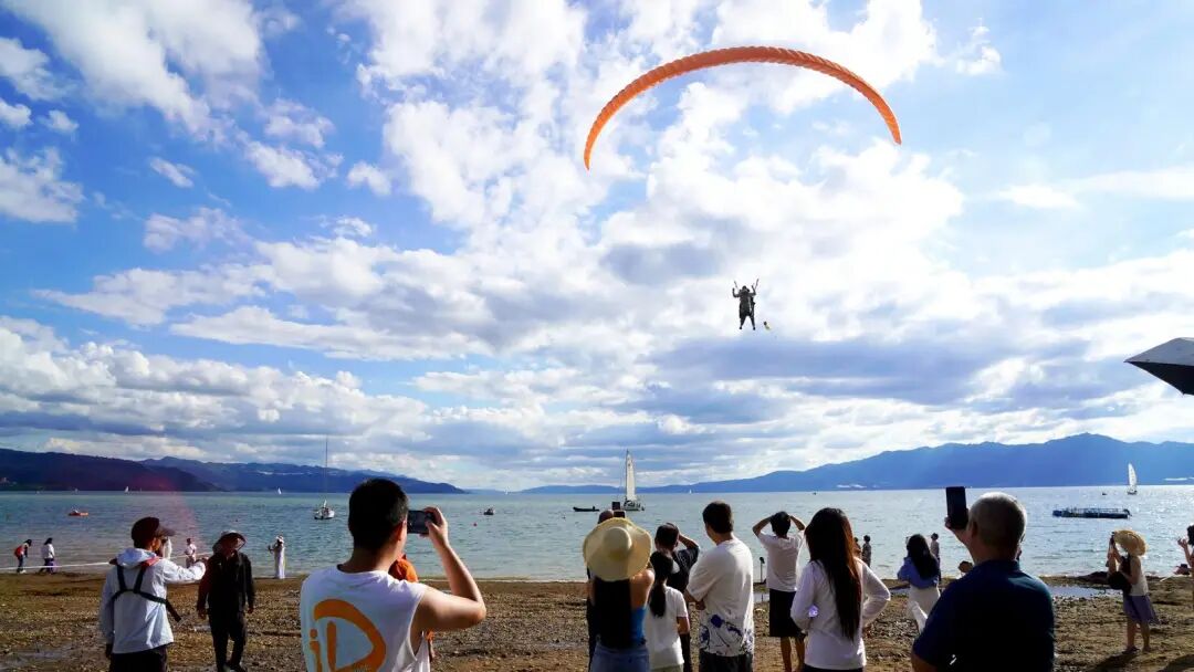 在抚仙湖区域,低空旅游与滑翔伞项目形成“空中观景双翼”,樱花谷直升机飞行体验吸引大量游客,体验人数达景区入园总量的十分之一,游客乘机腾空,俯瞰湖山交融的壮丽画卷,开启观光新视角;不远处的月亮湾国际滑翔伞营地,则以飘逸浪漫的飞行体验成为年轻游客的热门选择,色彩斑斓的伞翼翱翔于湖光山色之间,假日期间日均接待游客超百人,为抚仙湖增添一道跃动的风景线。