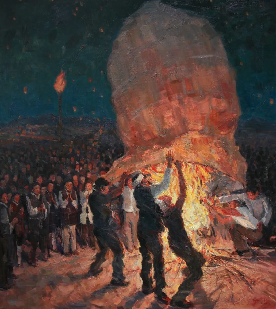 《白族火把节——孔明灯》,180×160cm,布面油画,2019年