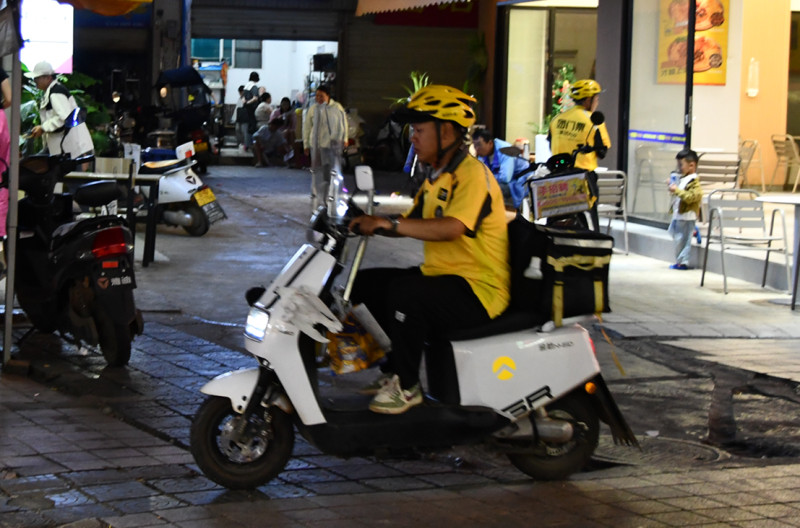 有骑着电动车疾驰的外卖小哥