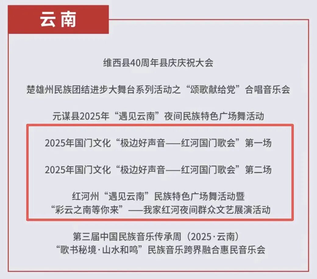 其中,红河州有3场入选,分别是:2025年国门文化“极边好声音 红河国门歌会”第一场、第二场,红河州“遇见云南”民族特色广场舞活动暨“彩云之南等你来”——我家红河夜间群众文艺展演活动。(来源:红河州文化馆)