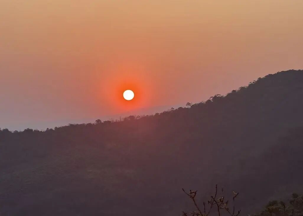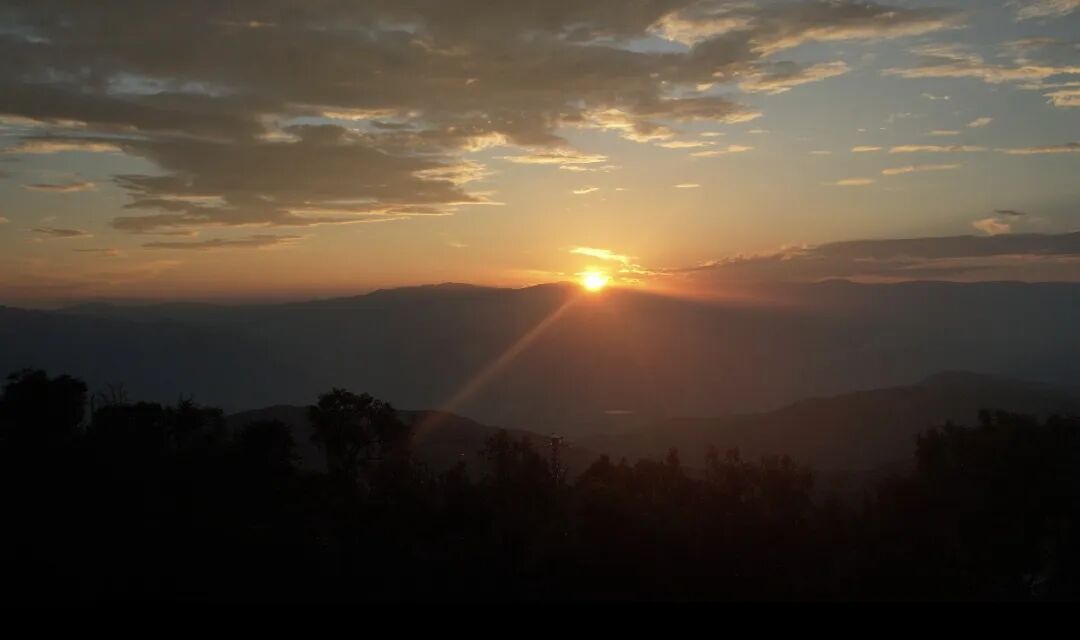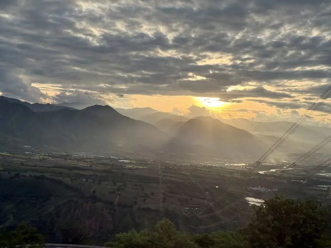 余晖洒落在山巅与树林间