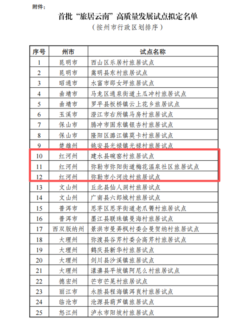 其中,红河州建水县碗窑村、弥勒市弥阳街道梅花温泉社区、弥勒市小河边村三地入选。