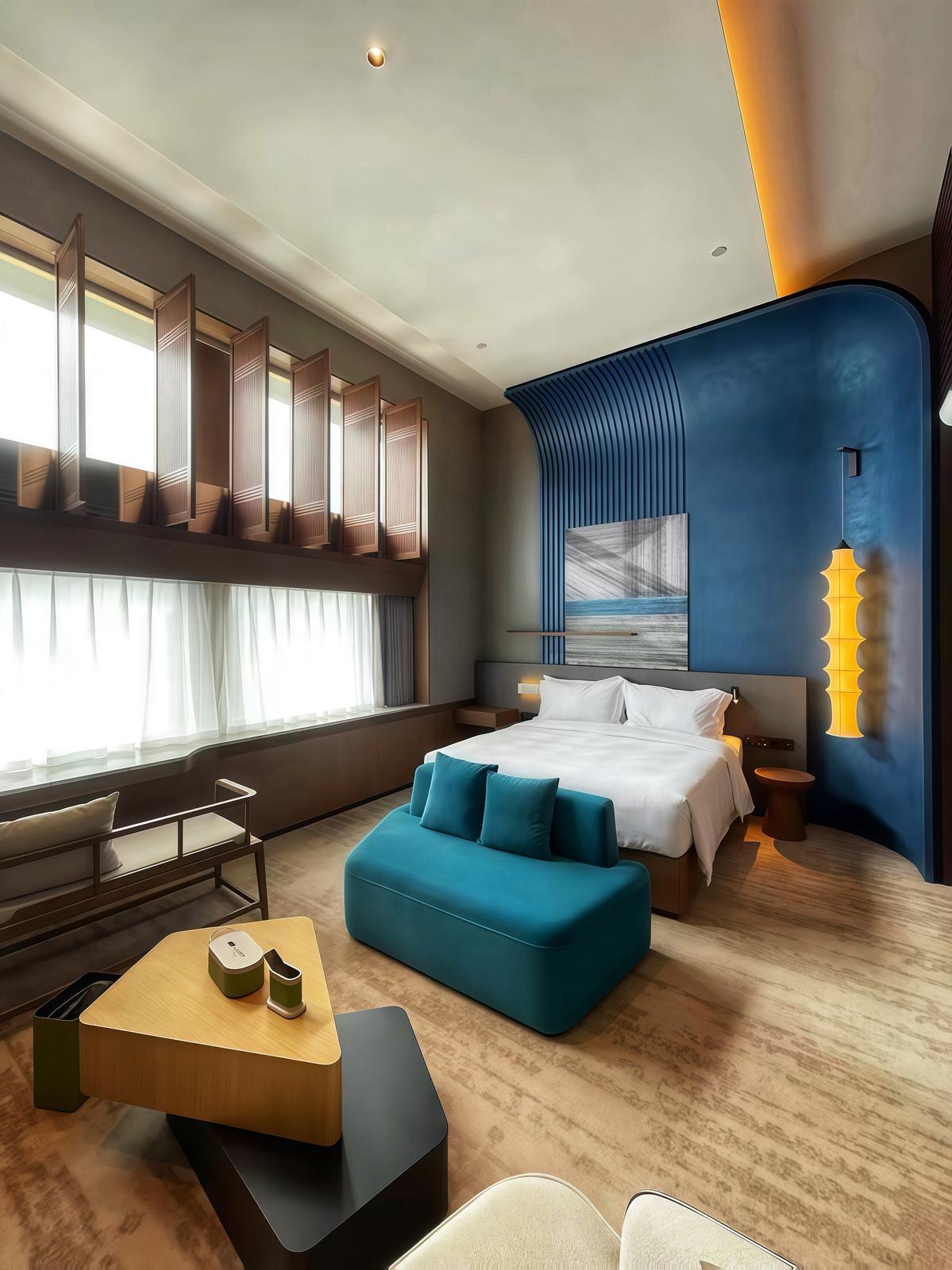 酒店设计由北京七十二创设计首席设计师张振科操刀,以“无主义风格”融合中华文化根基与西式美学。室内空间采用云南孔雀配色体系,孔雀羽毛纹理与少数民族彩色图案巧妙点缀,屏风、艺术玻璃上的抽象渐变“孔雀翎眼”纹理,营造出“神鸟遗影”的光影效果,实现现代与传统的美学对话。