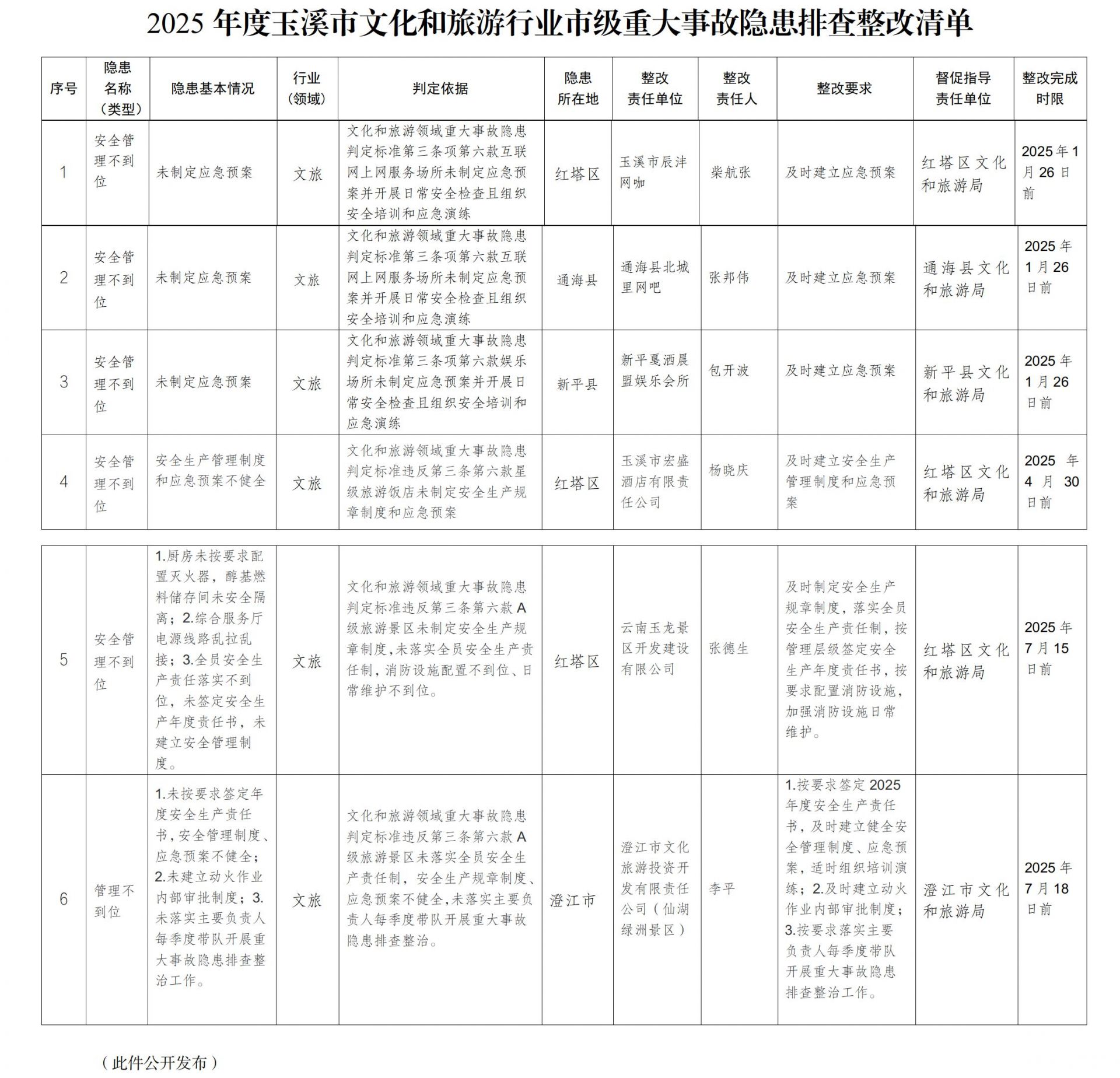 按照《玉溪市安全生产委员会关于印发2025年工作要点的通知》《玉溪市文化和旅游行业安全生产治本攻坚三年行动方案》(2024—2026年)要求,2025年1至9月市文化和旅游局联合市市场监督管理局、市消防救援支队开展安全生产联合督导检查,发现了一批重大事故隐患,现将《2025年度玉溪市文化和旅游行业市级重大事故隐患排查整改清单》印发公布,请各文化旅游经营主体举一反三,加强安全管理制度建设,健全完善全员安全生产责任制,结合单位实际完善应急预案,加强安全培训演练,做好设施器材日常维护工作,全面履行安全生产主体责任,不断提升安全生产水平。
