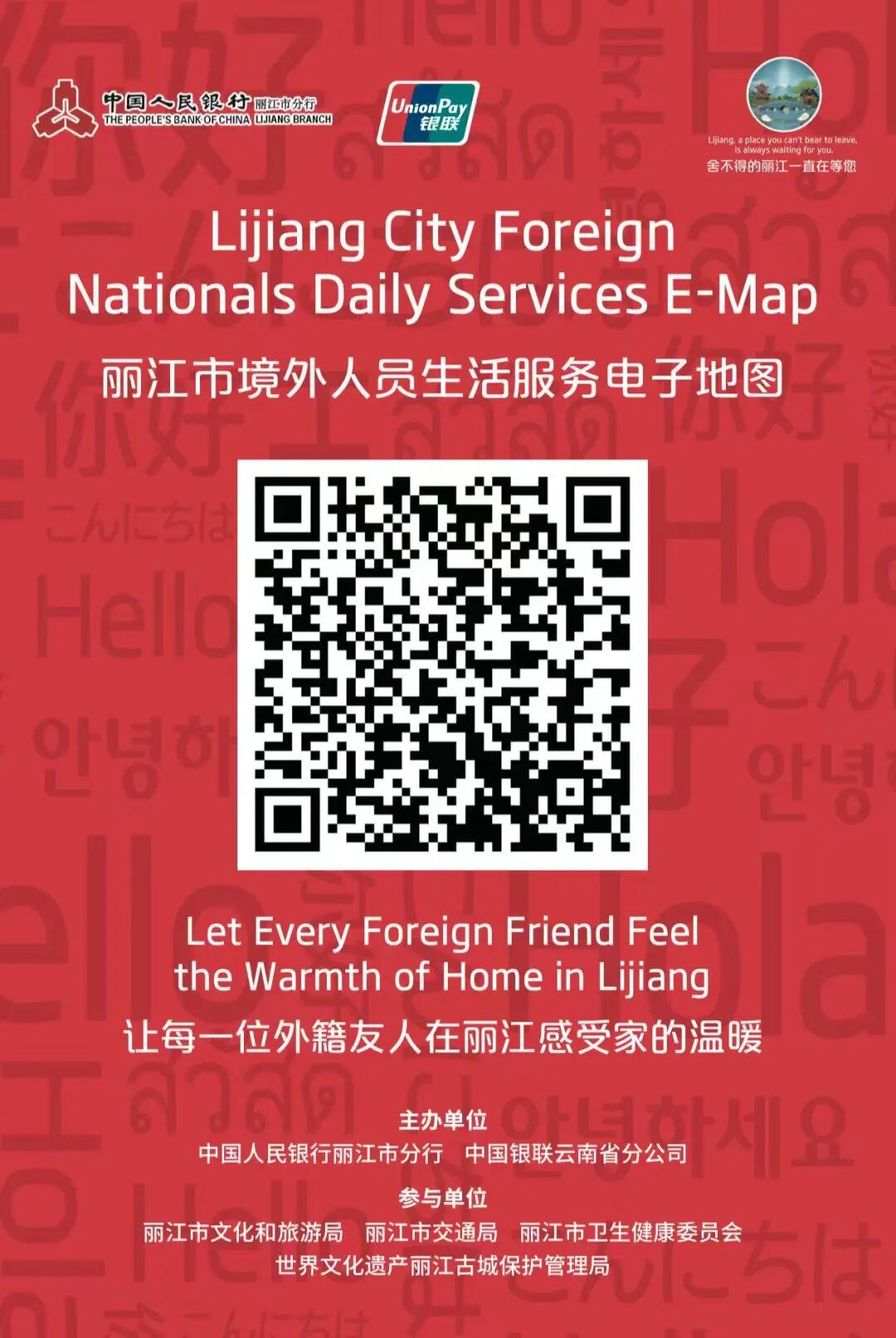 10月22日,为进一步提升外籍来丽人员旅居便利性,助力丽江打造国际化旅游目的地,由中国人民银行丽江分行牵头,丽江市文化和旅游局、市交通局、市卫生健康委员会、古城保护管理局等多部门参与的《丽江市境外人员生活服务电子地图》(以下简称《电子地图》)正式上线。