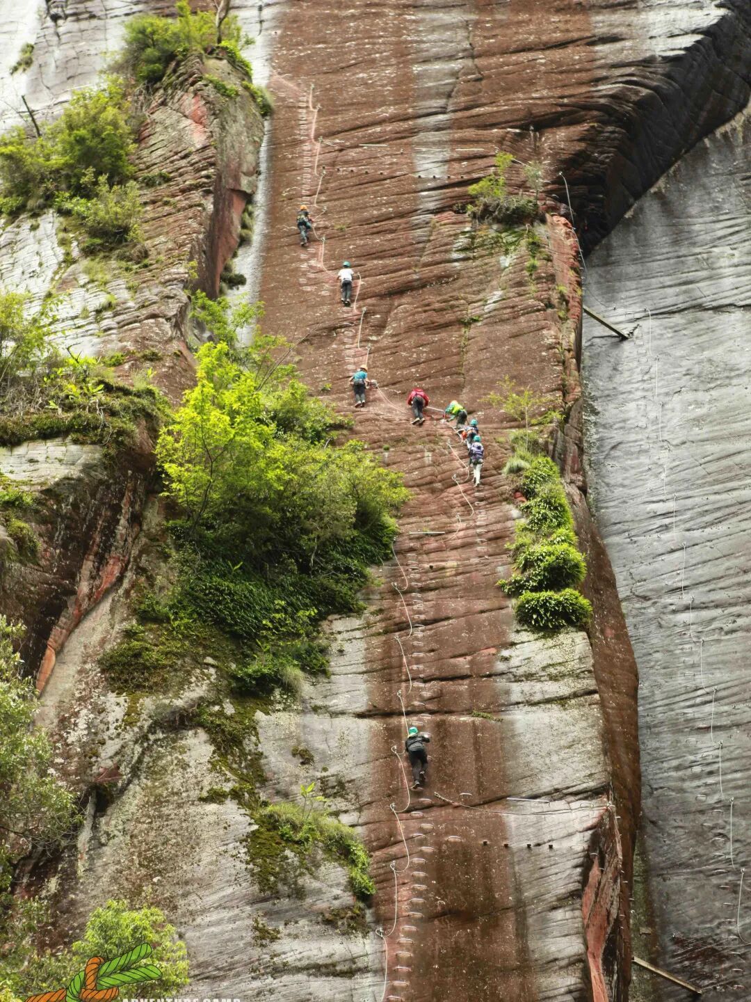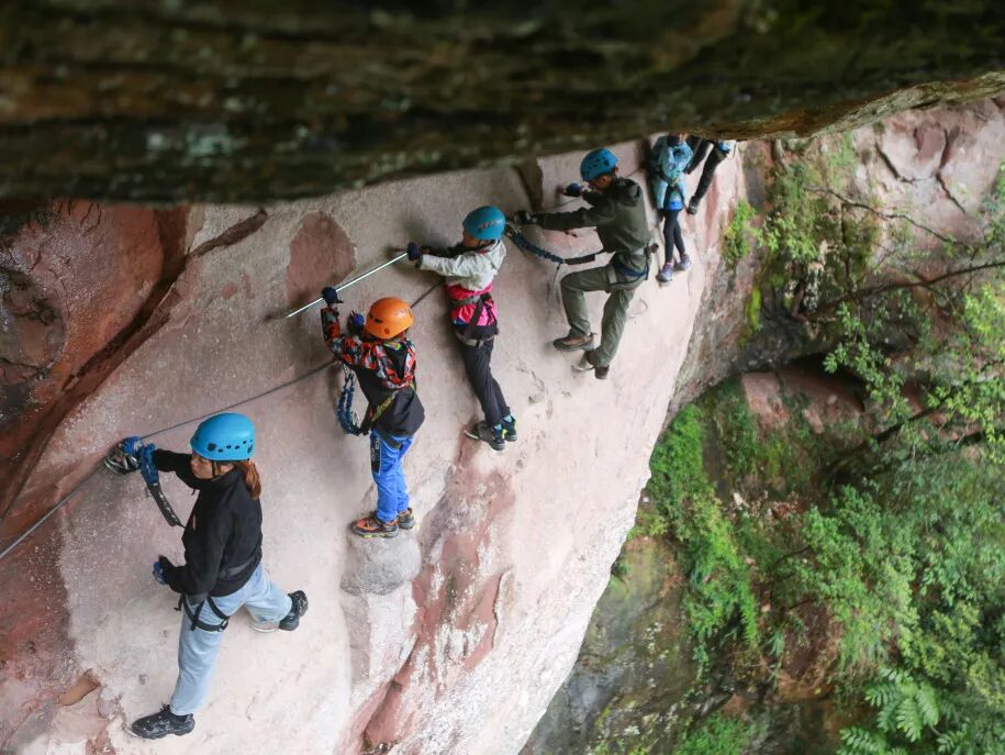 丽江老君山的丹霞赤壁是户外爱好者的挑战之地。当地出色的飞拉达线路结合了乐趣和探索、运动与自然,安全刺激的体验让攀登者从全新的角度来欣赏周边的美景。穿上专业的攀岩装备,在教练的指导下向上攀登,登顶时刻,俯瞰群山连绵,云雾缭绕,心中的成就感油然而生。夜幕降临,便可以到山脚的帐篷营地落脚,围着篝火畅谈天地,抬头便是璀璨的星空,伸手就能触摸到银河。无论你想在这里收获什么样的治愈,老君山都会拂去你心灵上的尘埃。