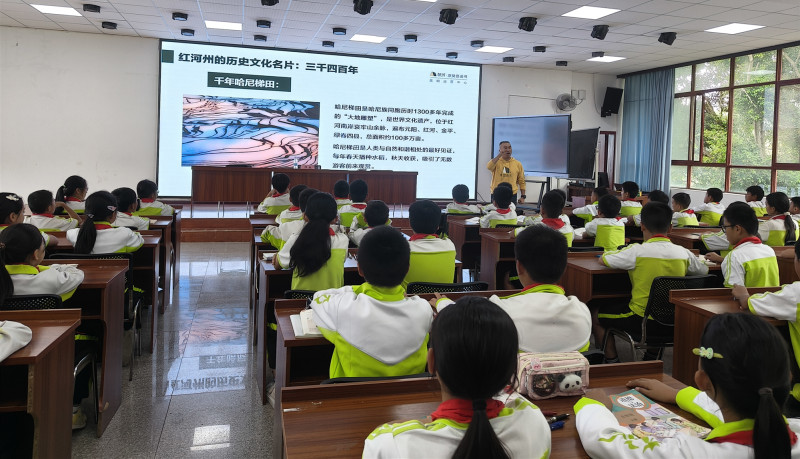 在红河县,活动以《什么是云南·解码红河》为主题,带领孩子们穿越家乡“三千四百年”的历史长河,通过生动的讲述和积极的互动,让孩子们对红河深厚的文化底蕴有了更深刻的认知,家乡自豪感油然而生。在金平县活动则采取双主题并行的方式,一边畅谈《什么是云南》中家乡的自然与人文之美,一边深研《侵华日军第9420部队及云南细菌战研究》,引导学生在铭记历史中珍爱和平、奋发前行,充分彰显了阅读在文化传承与爱国主义教育中的双重价值。在弥勒市,老师对《千山万水:中国申遗故事》的深度解读,从长城、殷墟的宏大叙事,延伸至红河元阳梯田、普洱景迈山古茶林的文化智慧,将世界遗产保护与家乡文化根脉紧密相连,激发了同学们守护文明、热爱家乡的深厚情感。