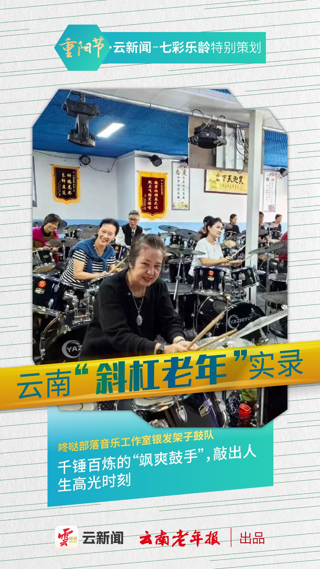 昆明市西山区春雨路937工业园区内的“咚哒部落音乐工作室”中,架子鼓“银发天团”的成员们都会齐聚一堂进行排练。她们中年纪最轻的也已年过半百,而最年长的更是年逾八旬。看她们动作整齐划一,宛如经过无数次锤炼,谁能料到,这群如今在鼓点中熠熠生辉的老者,最初竟是对着沙发垫练习握鼓技巧?“当初被问及为何选择打鼓,我回答道,我心中有故事,我的独子已离我而去,内心满是哀伤。”80岁的张佳明感慨道,如今,她已逐渐走出丧子之痛的阴影,鼓槌起落间,洋溢着快乐与精彩。“直到开始打架子鼓,我才明白,快乐能战胜年龄,敲出的是人生的璀璨篇章。”