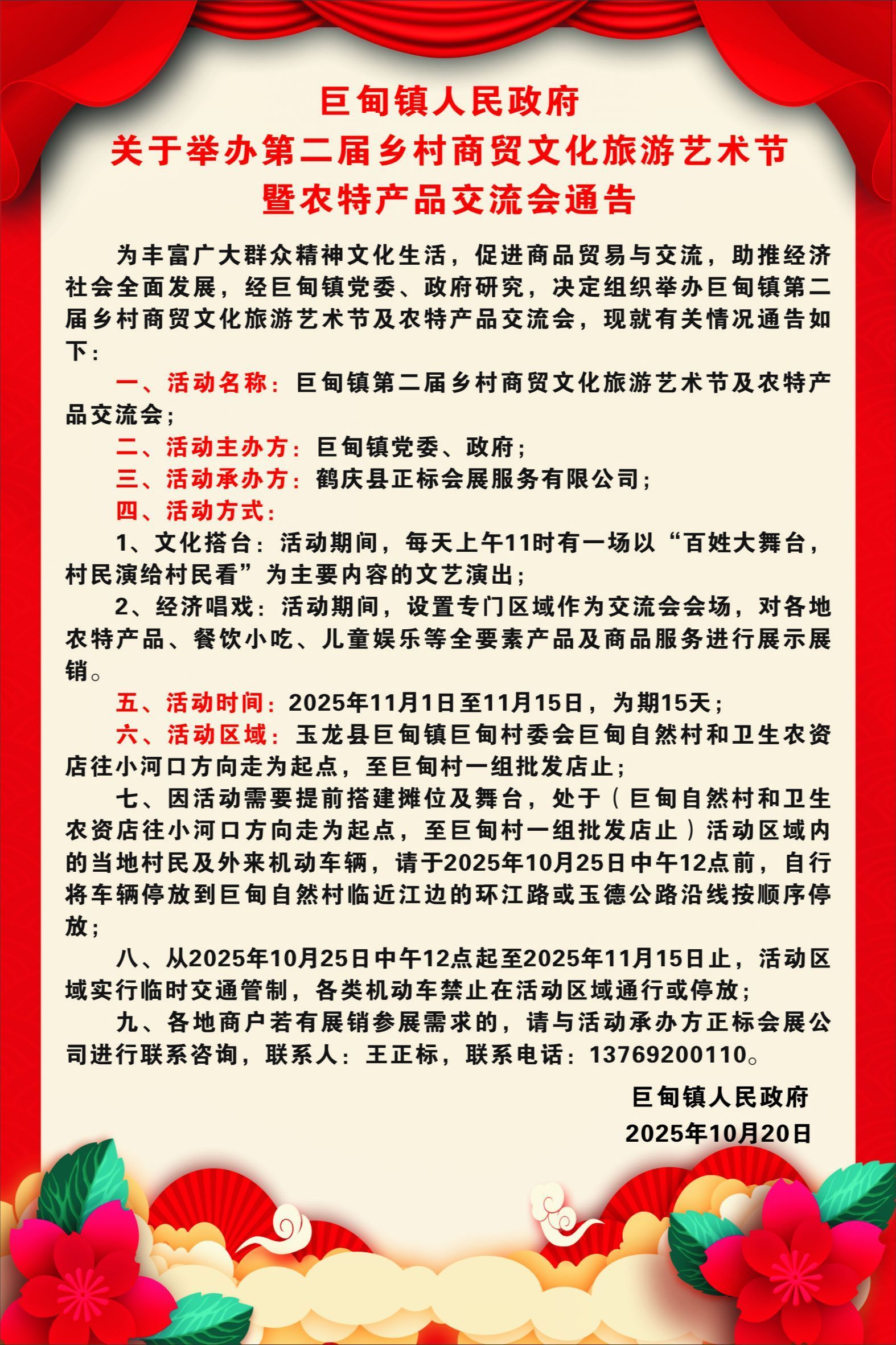 丽江巨甸将举办乡村商贸文化旅游艺术节及农特产品交流会 2025-10-30 15:07 0 为丰富广大群众精神文化生活,促进商品贸易与交流,助推经济社会全面发展,11月1日至11月15日,丽江市玉龙县巨甸镇将举办第二届乡村商贸文化旅游艺术节及农特产品交流会。 来源 巨甸镇人民政府 责编 张楠 校对 刘榕杉 审核 华芳