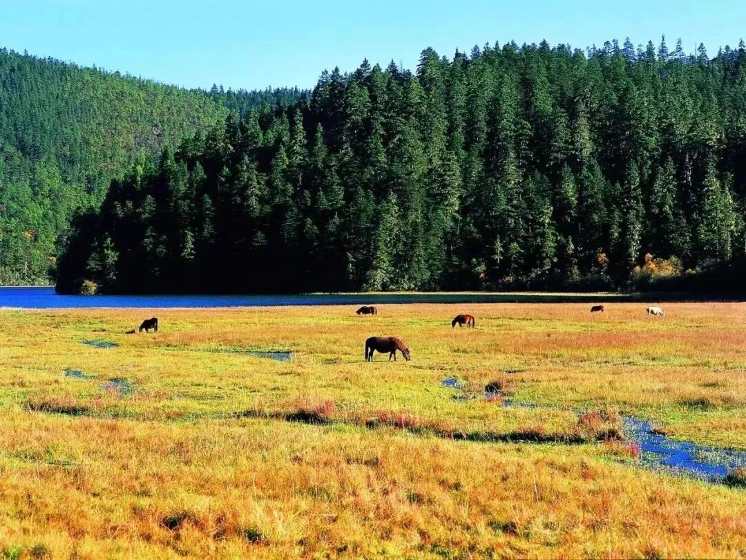 秋天的普达措,褪去了夏季的葱郁,漫山植被染上金黄与绯红,澄澈的属都湖、碧塔海如宝石般镶嵌在群山间,每一处景致都似精心勾勒的高原秘境画卷。
